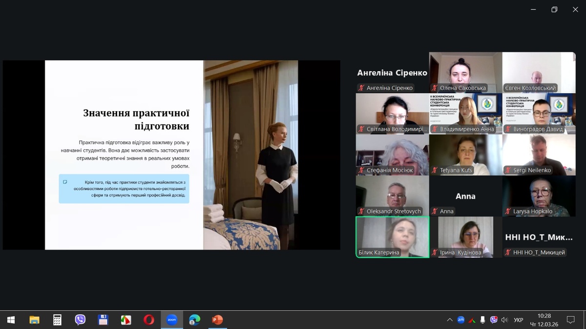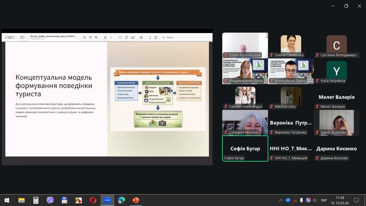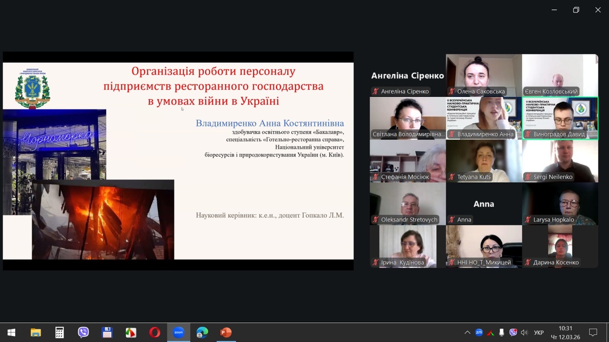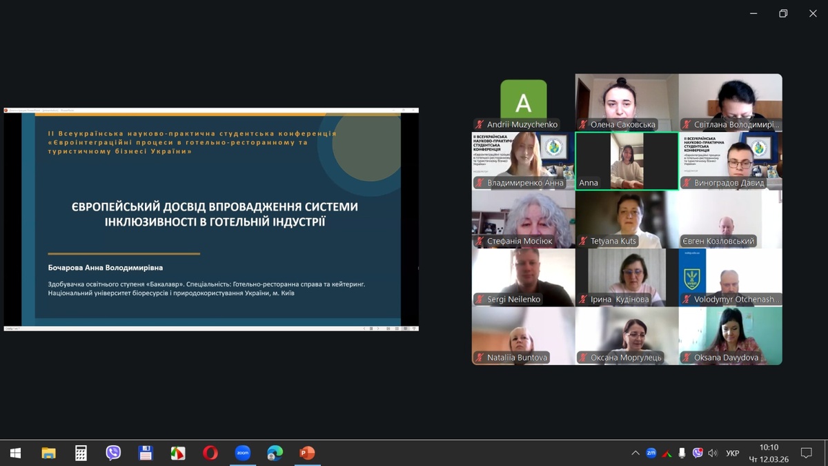 12 березня 2026 р. на кафедрі готельно-ресторанної справи та туризму економічного факультету Національного університету біоресурсів і природокористування України відбулася ІІ Всеукраїнська науково-практична студентська конференція «Євроінтеграційні процеси в готельно-ресторанному та туристичному бізнесі України», яка зібрала понад 150 учасників із 15 вітчизняних закладів вищої освіти з різних регіонів України: Києва, Запоріжжя, Житомира, Кам’янець-Подільського, Луцька, Полтави, Харкова, Умані та інших міст.