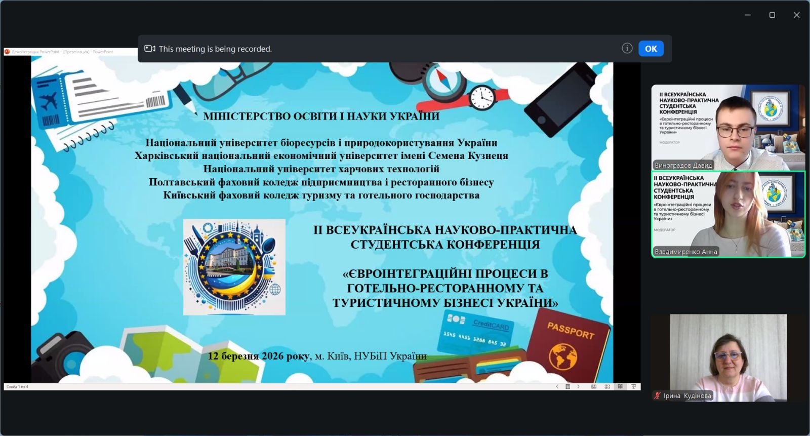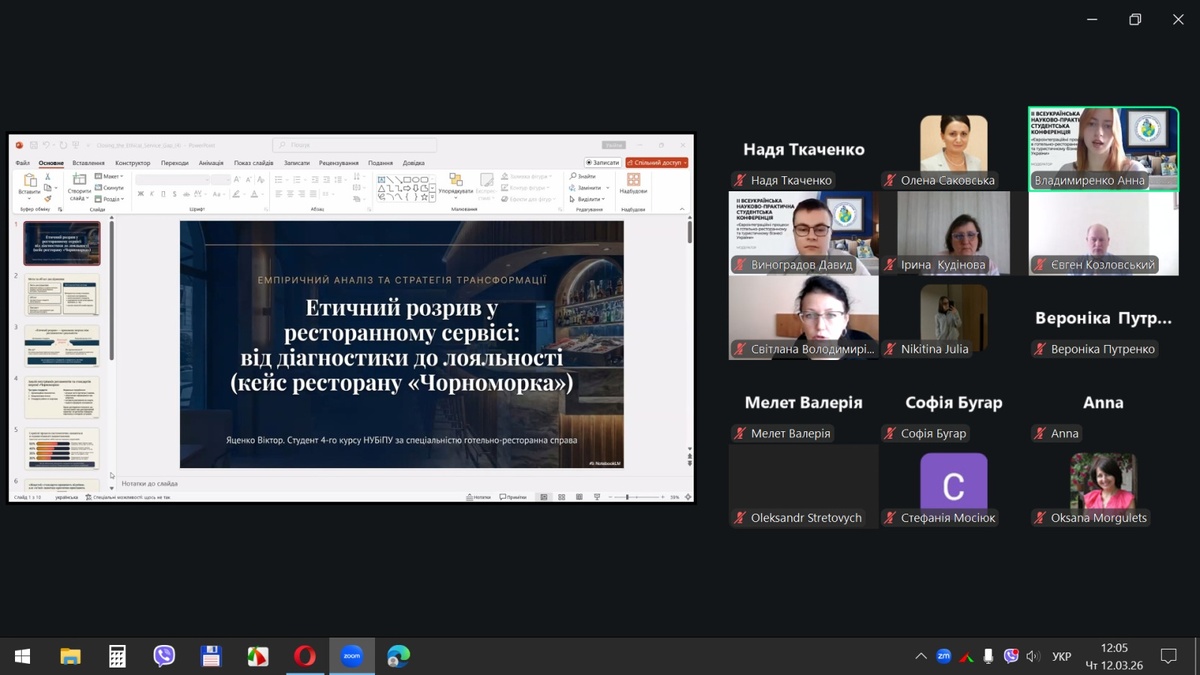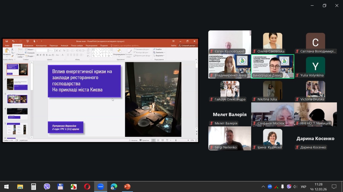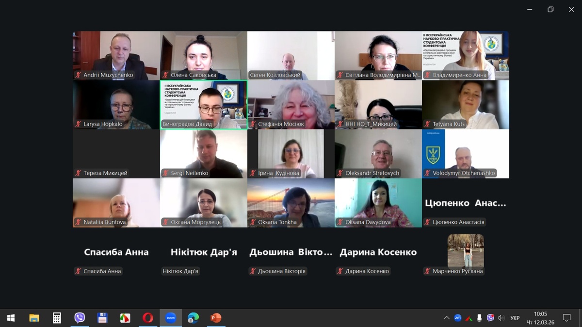 12 березня 2026 р. на кафедрі готельно-ресторанної справи та туризму економічного факультету Національного університету біоресурсів і природокористування України відбулася ІІ Всеукраїнська науково-практична студентська конференція «Євроінтеграційні процеси в готельно-ресторанному та туристичному бізнесі України», яка зібрала понад 150 учасників із 15 вітчизняних закладів вищої освіти з різних регіонів України: Києва, Запоріжжя, Житомира, Кам’янець-Подільського, Луцька, Полтави, Харкова, Умані та інших міст.