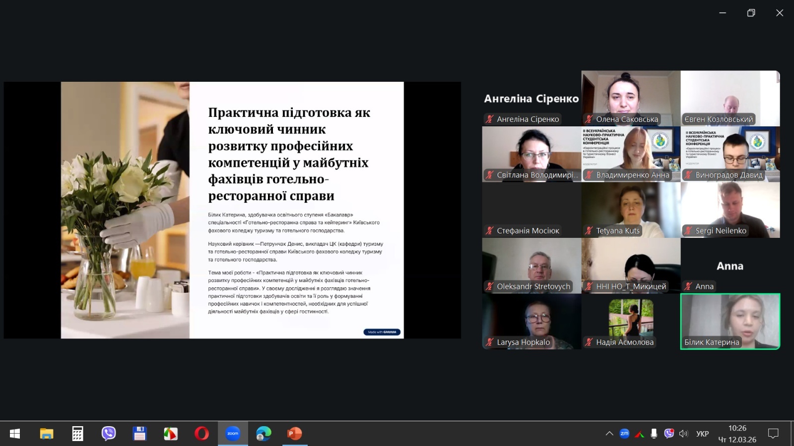 Завідувачка кафедри готельно-ресторанної справи та туризму НУБіП України, доктор економічних наук, професор Світлана МЕЛЬНИЧЕНКО у своєму виступі окреслила ключові виклики та можливості, що постають перед галуззю на шляху до євроінтеграції. Її слова надихнули учасників підійти до доповідей з максимальною серйозністю та ентузіазмом.