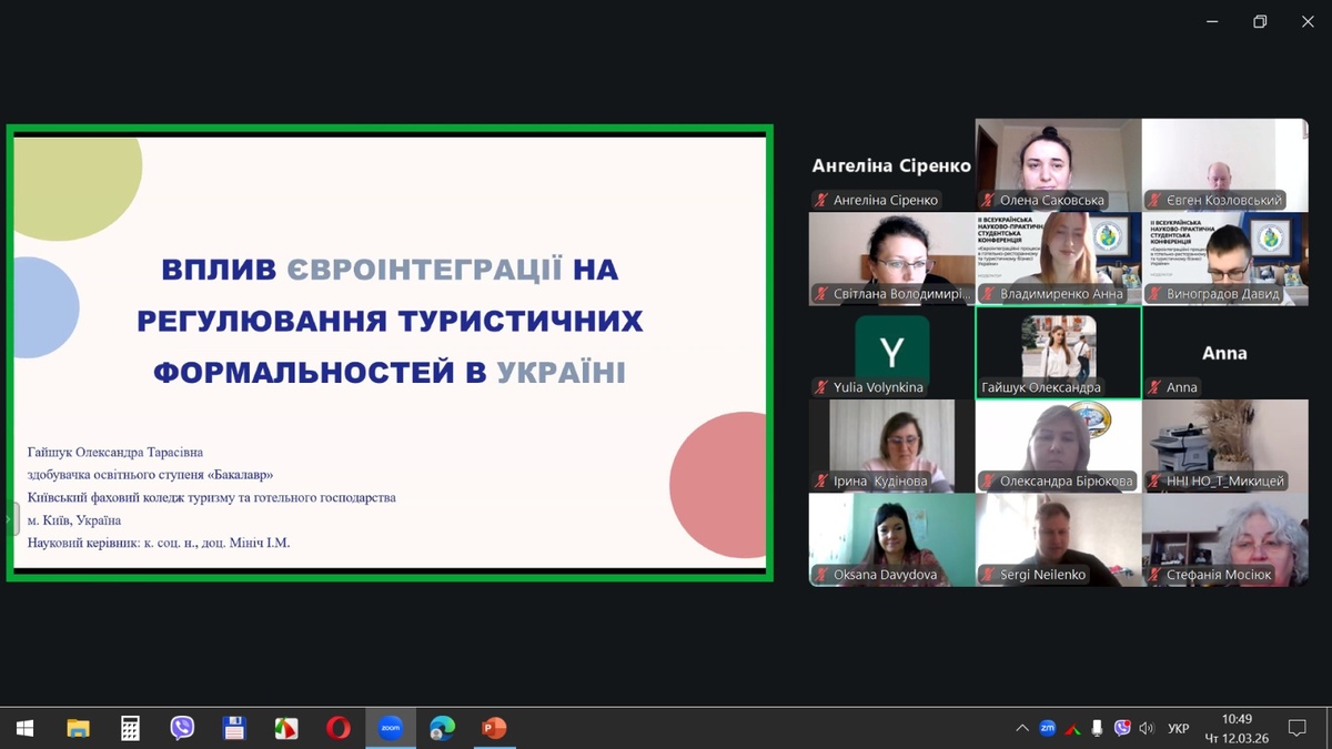 Олександра ГАЙШУК, здобувачка вищої освіти Київського фахового коледжу туризму та готельного господарства, виступила із доповіддю на тему «Вплив євроінтеграції на регулювання туристичних формальностей в Україні». Вона здійснила системний аналіз змін у нормативно-правовому регулюванні туристичної діяльності в контексті наближення до стандартів ЄС.