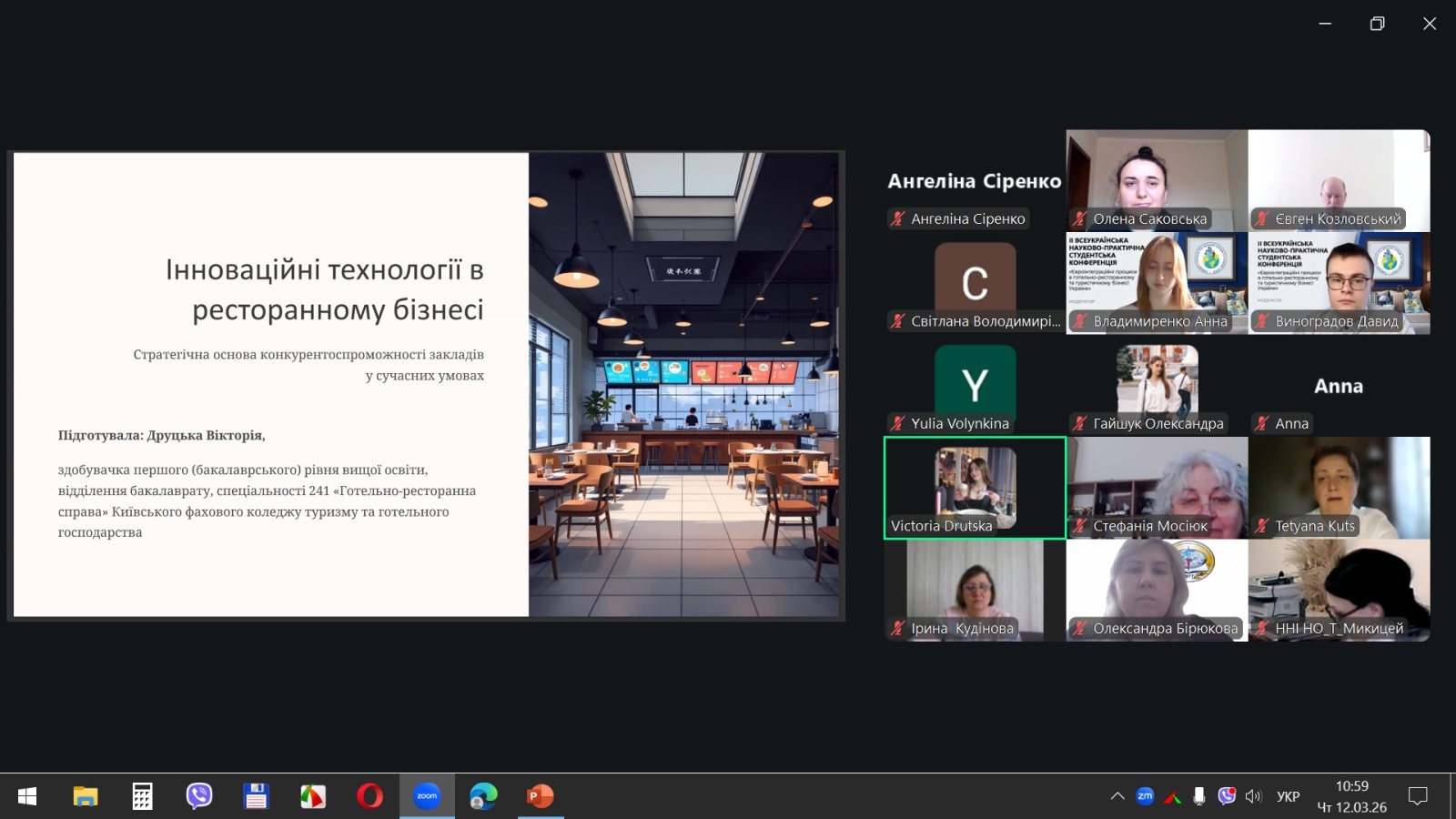 «Інноваційні технології в ресторанному бізнесі» – цікава доповідь Вікторії ДРУЦЬКОЇ, студентки Київського фахового коледжу туризму та готельного господарства. Здобувачка здійснила огляд цифрових трансформацій у ресторанній справі від автоматизованих систем замовлень до штучного інтелекту. Для України це питання конкурентоспроможності та залучення інвестицій у галузь.
