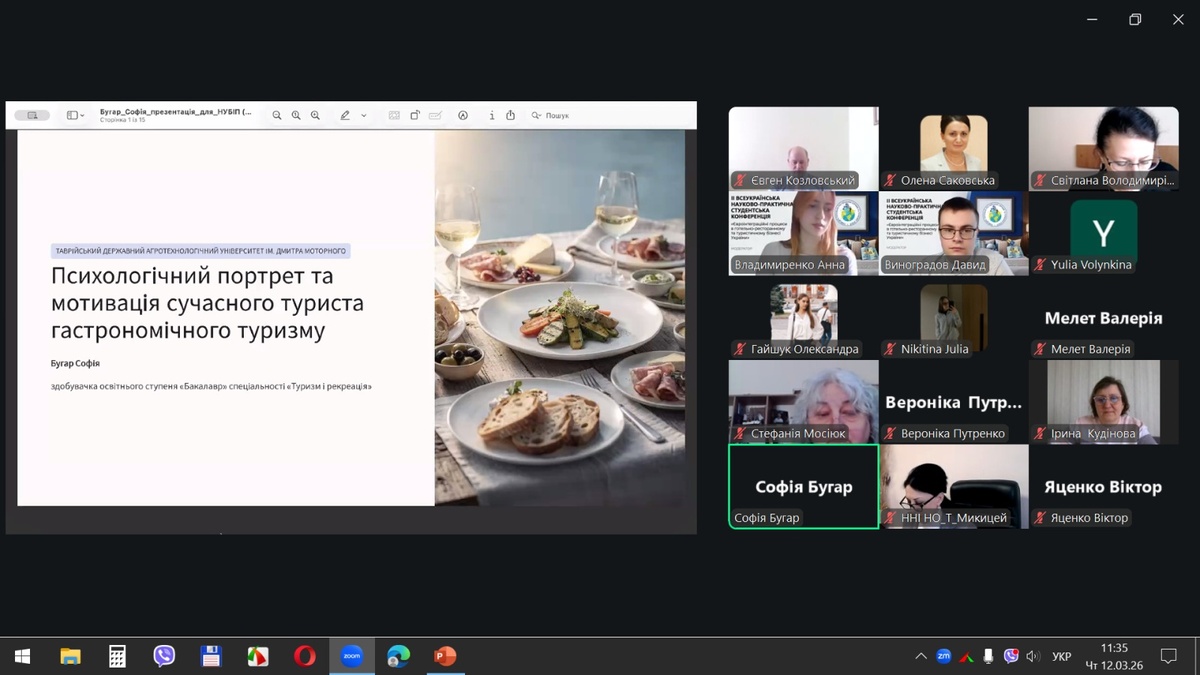 Софія БУГАР (Таврійський державний агротехнологічний університет ім. Дмитра Моторного) виступила із доповіддю на тему «Психологічний портрет та мотивація сучасного туриста гастрономічних турів». Дослідження присвячено споживчій психології в гастрономічному туризмі, одному з найбільш динамічних сегментів ринку. Для підприємців – це готові інструменти маркетингу та розробки продуктів, що відповідають справжнім потребам туристів.