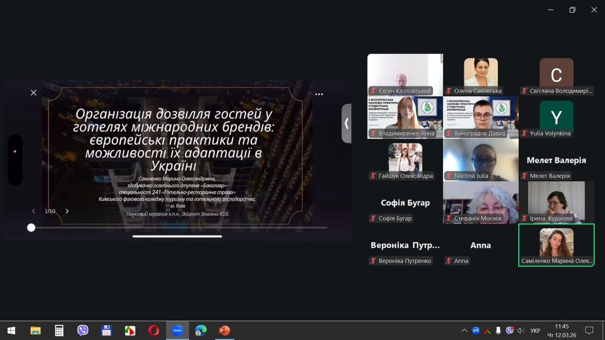 Марина САМІЛЕНКО, здобувачки вищої освіти цього ж коледжу, презентувала результати досліджень на тему «Організація дозвілля гостей у готелях міжнародних брендів: європейські практики та можливості їх адаптації в Україні». Студентка здійснила порівняльний аналіз кращих практик розважальних програм у готелях міжнародних мереж та окреслила можливості їх адаптації до українських реалій. Результати дослідження є цінним ресурсом для підвищення конкурентоспроможності вітчизняних готелів на міжнародному ринку.