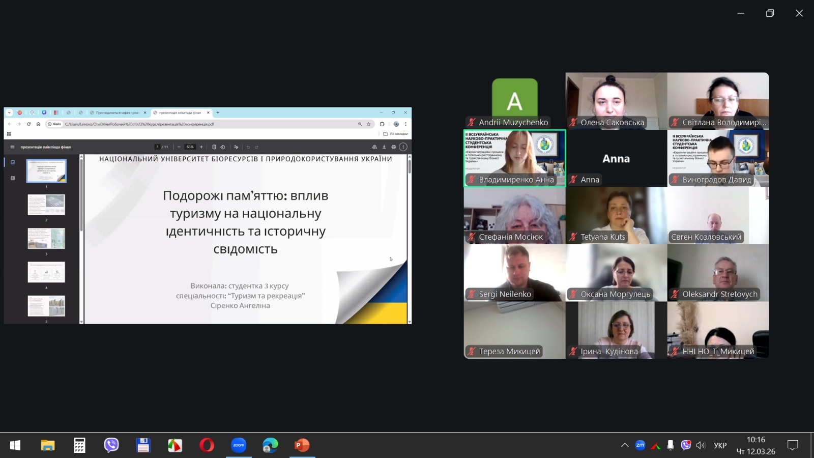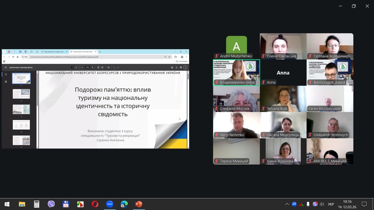 Ангеліна СІРЕНКО, здобувачка вищої освіти НУБіП України, виступила із доповіддю на тему «Подорожі пам'яттю: вплив туризму на національну ідентичність та історичну свідомість». Доповідь торкається надзвичайно актуальної теми в контексті війни: як туризм стає засобом збереження та відновлення національної пам'яті. Практична цінність – розробка маршрутів пам'яті як інструменту культурної дипломатії та патріотичного виховання.