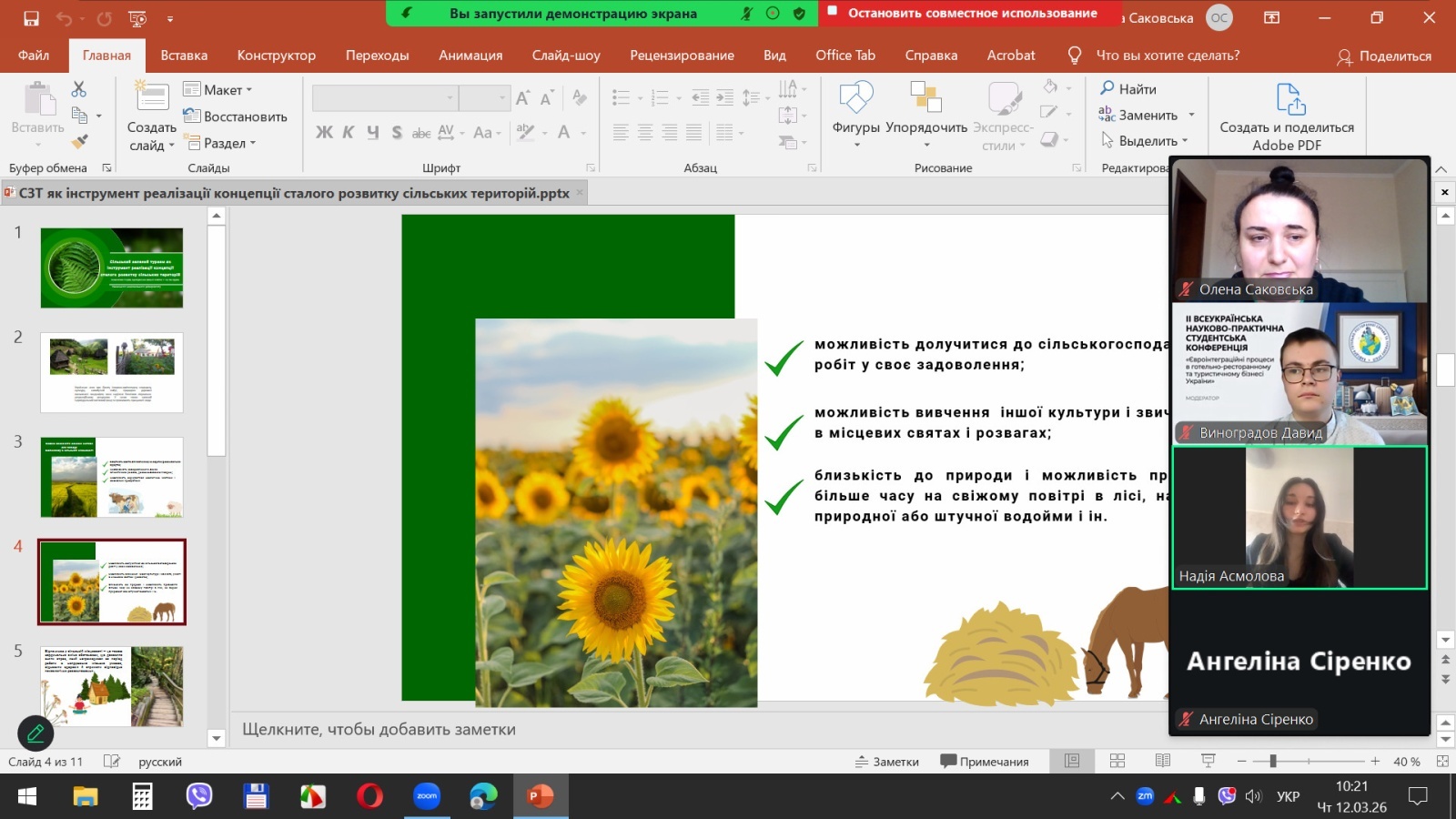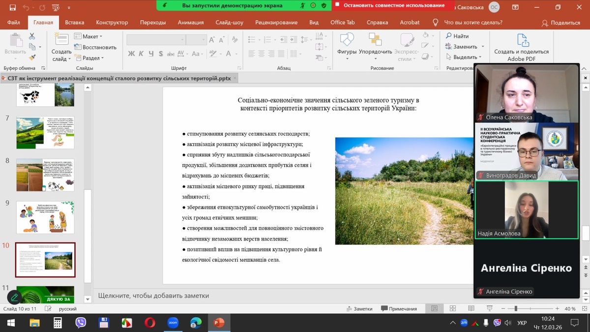 Надія АСМОЛОВА, здобувачка вищої освіти Уманського національного університету, присвятила свою доповідь темі «Сільський зелений туризм як інструмент реалізації концепції сталого розвитку сільських територій». Науковий керівник – кандидат економічних наук, доцент кафедри туризму та готельно-ресторанної справи Олена САКОВСЬКА.