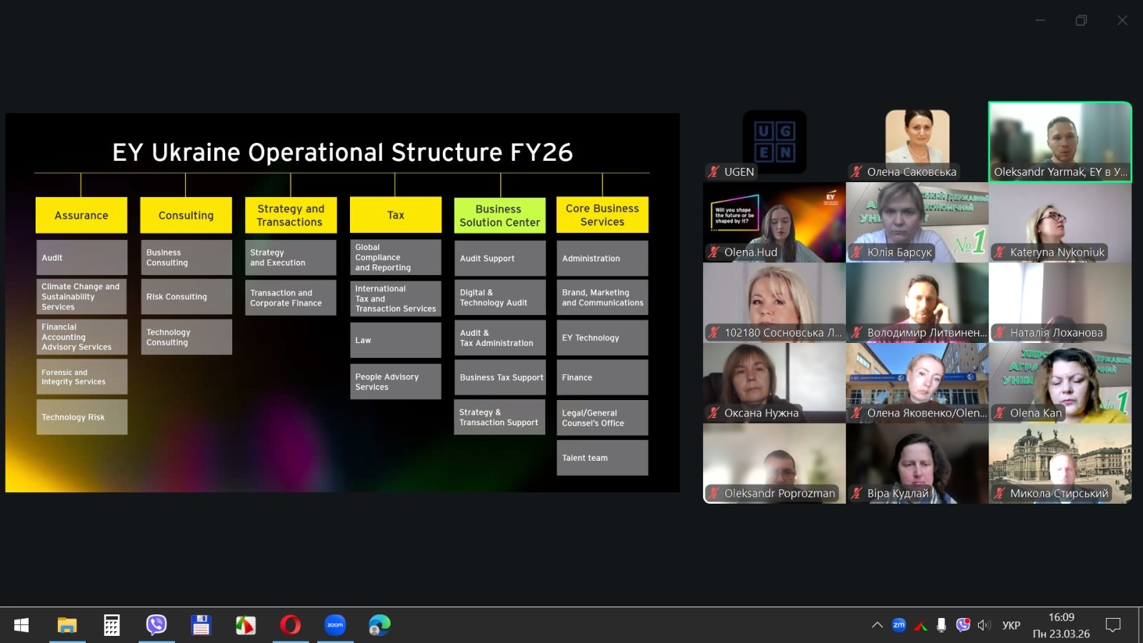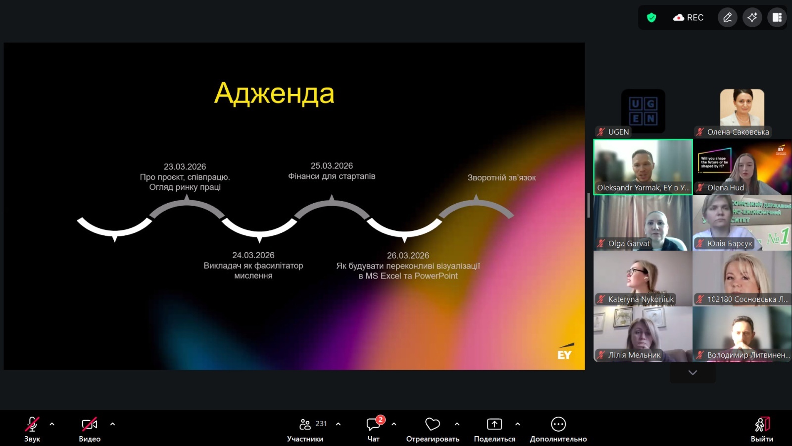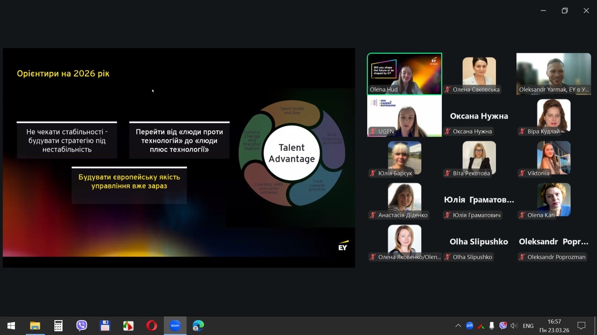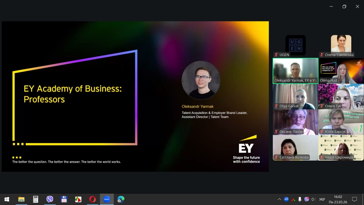 23–26 березня 2026 року відбулася серія онлайн-зустрічей у межах освітнього проєкту EY Academy of Business: Professors, організованих командою UGEN за підтримки EY. Зазначена ініціатива спрямована на впровадження сучасних підходів до викладання, підвищення якості освітнього процесу та інтеграцію практикоорієнтованих бізнес-інструментів у систему підготовки здобувачів вищої освіти.