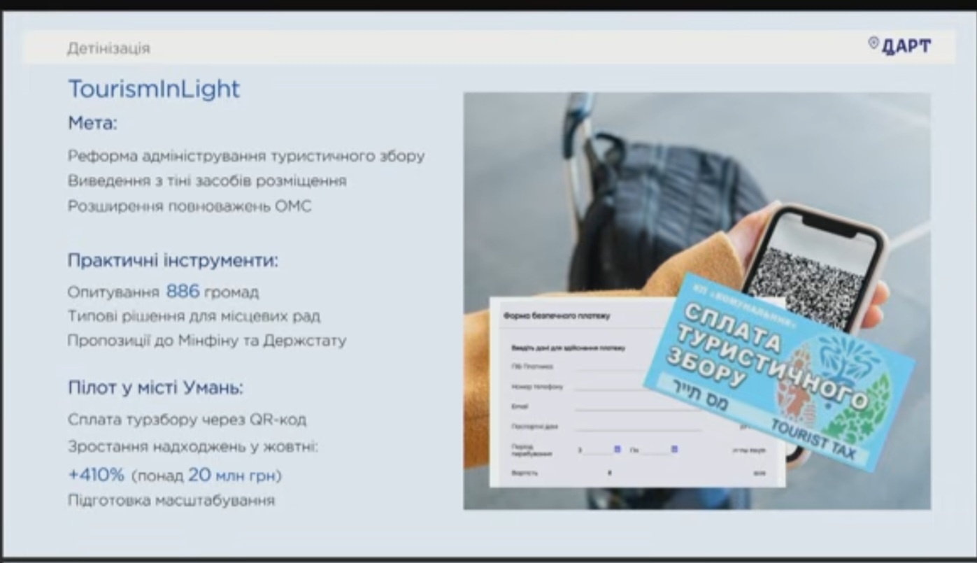 Одним із ключових досягнень стала цифрова трансформація галузі. Модернізація Єдиного туристичного реєстру передбачає автоматизацію адміністрування туристичного збору, інтеграцію з державними системами та формування аналітики для стратегічного планування. Паралельно триває реформа детінізації ринку: громади отримують нові інструменти адміністрування збору, а пілотні рішення – зокрема QR-оплата для паломників в Умані уже дали багаторазове зростання надходжень.