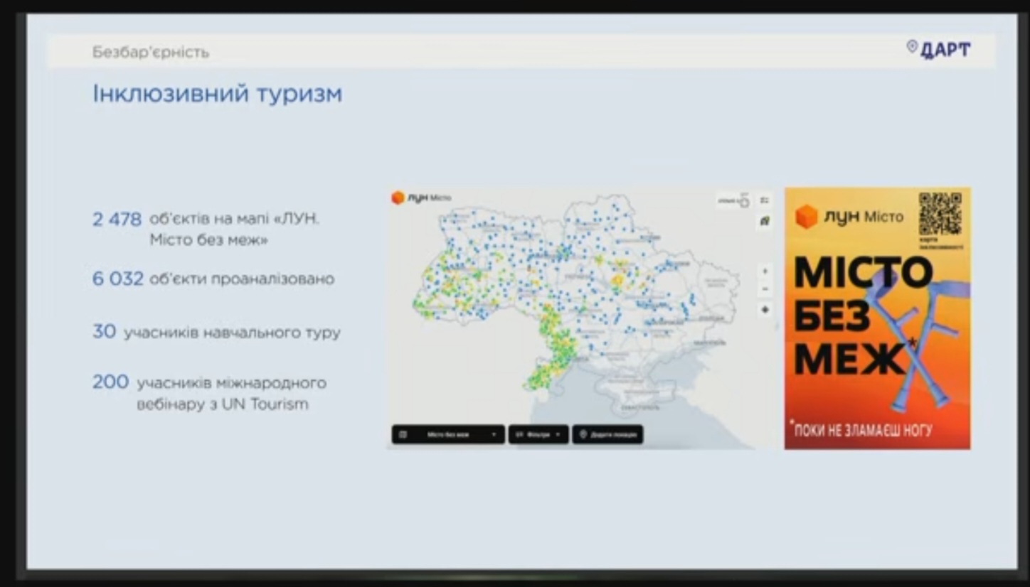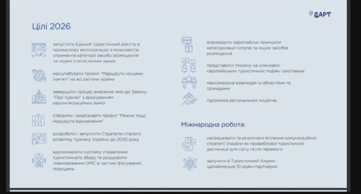 Україна суттєво посилила міжнародну присутність: брала участь у ключових подіях UN Tourism, Конференції з відновлення України, засіданнях Європейської туристичної комісії, а також підписала меморандум про співпрацю з Іспанією. Створено передумови для запуску Туристичного альянсу на підтримку повоєнного відновлення галузі.