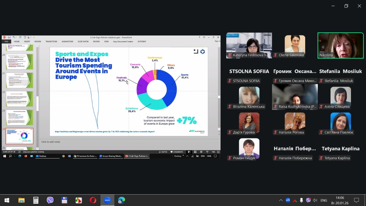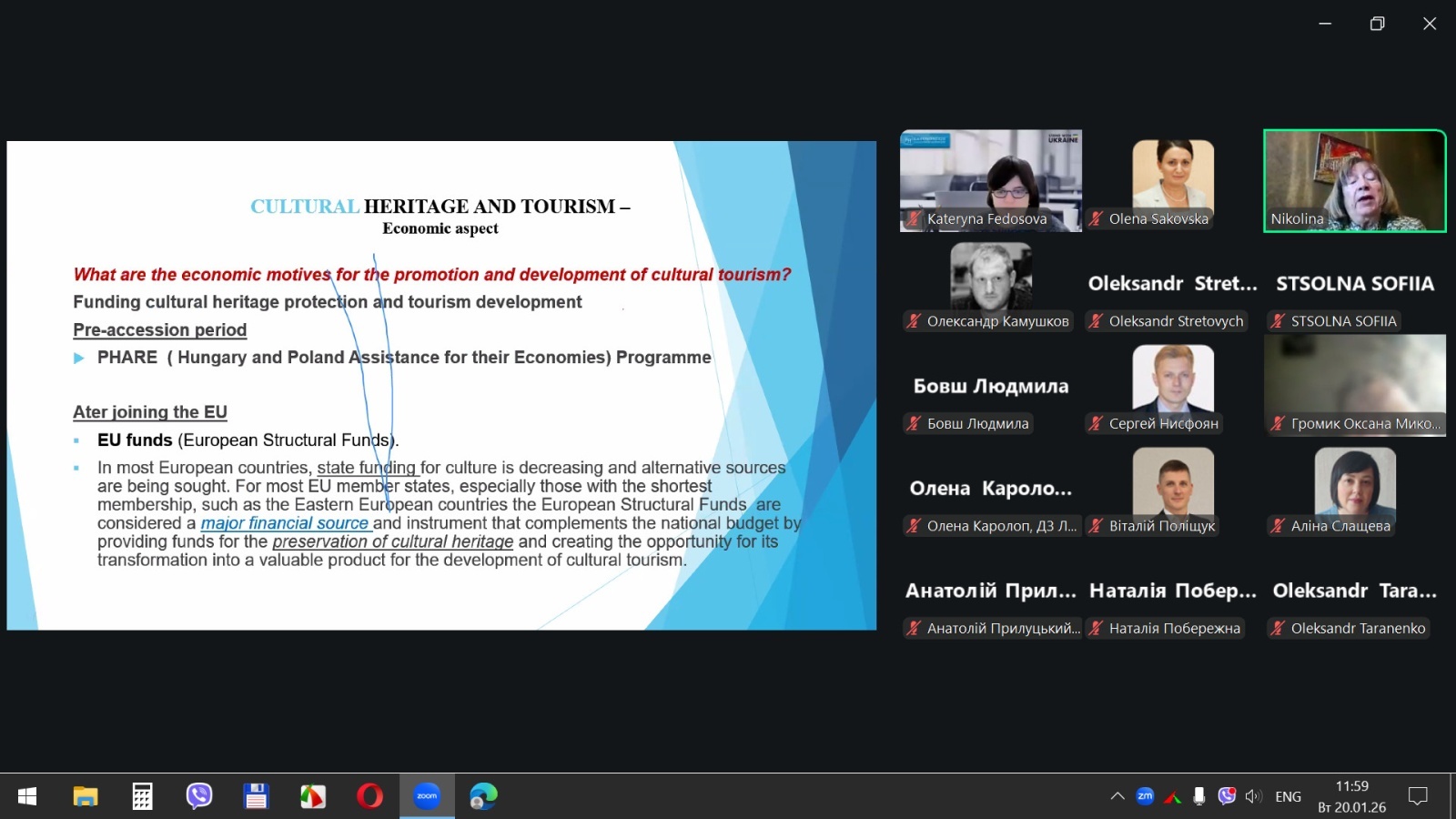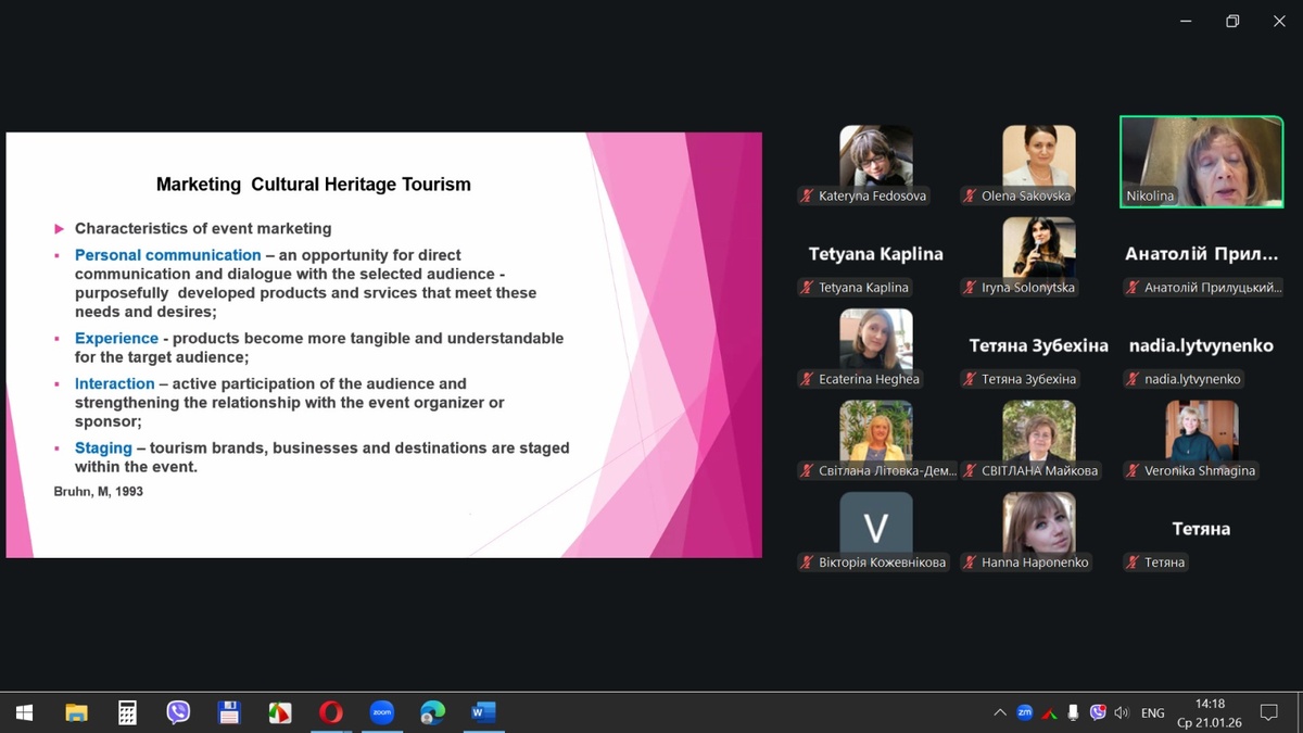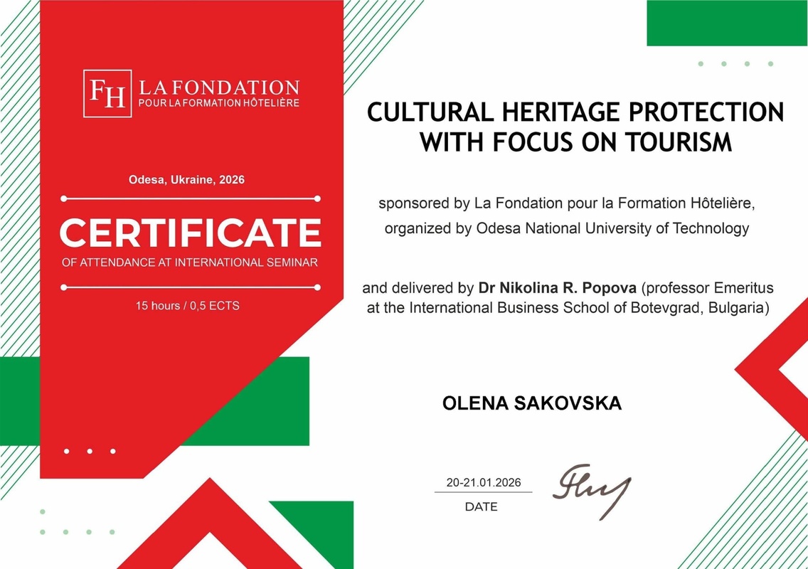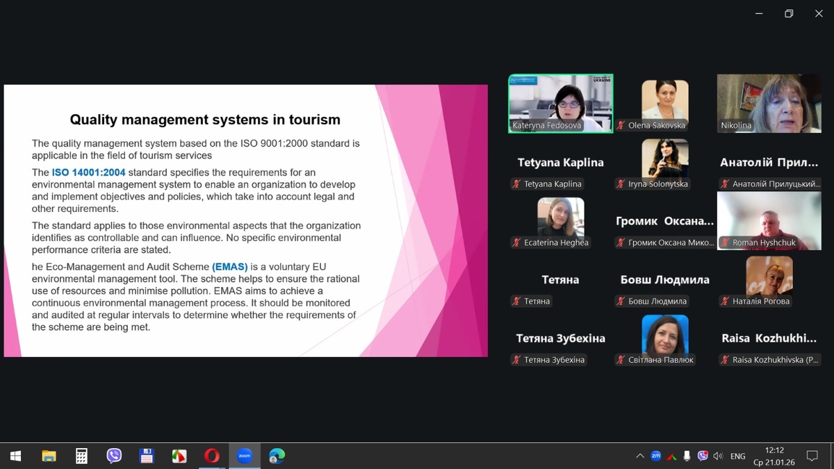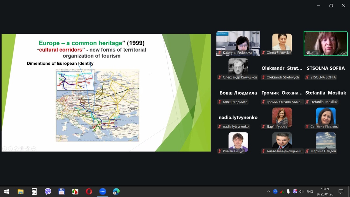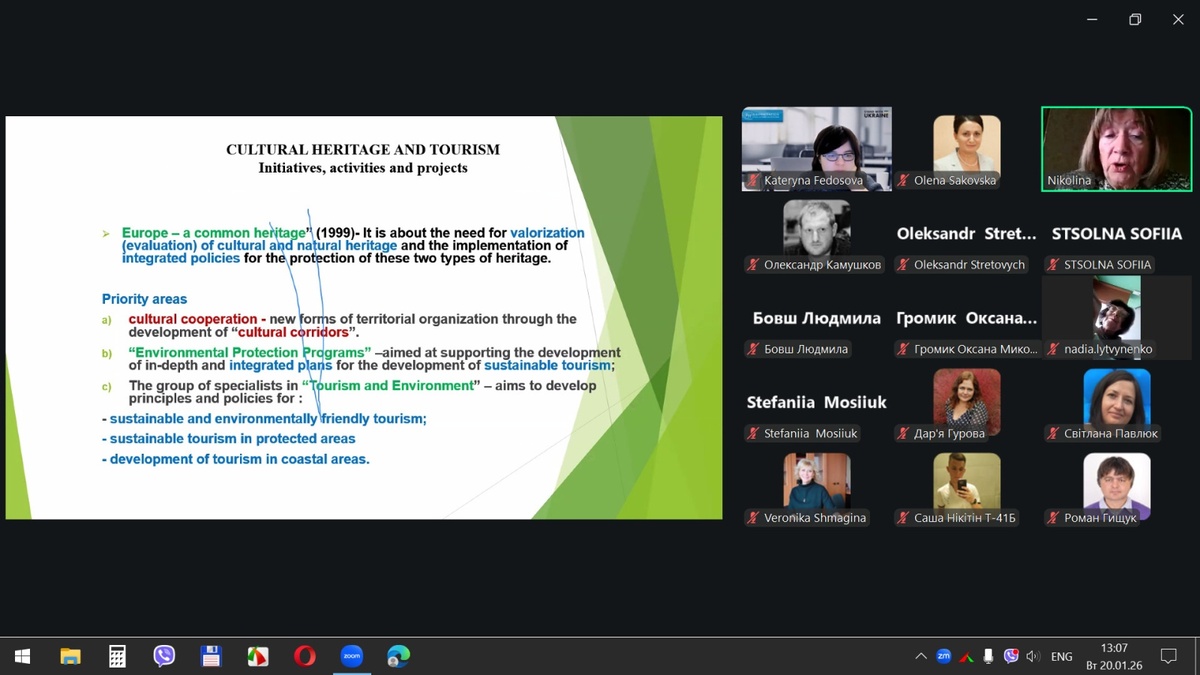 20-21 січня 2026 року здобувачі вищої освіти спеціальностей «Туризм та рекреація», «Готельно-ресторанна справа та кейтеринг» і науково-педагогічні працівники кафедри туризму та готельно-ресторанної справи Уманського національного університету взяли участь у міжнародному вебінарі «Збереження культурної спадщини у фокусі туризму» на англійській мові, який став цінним ресурсом для здобувачів освіти та викладачів, зацікавлених у поглибленні знань у сфері туризму та охорони культурної спадщини.