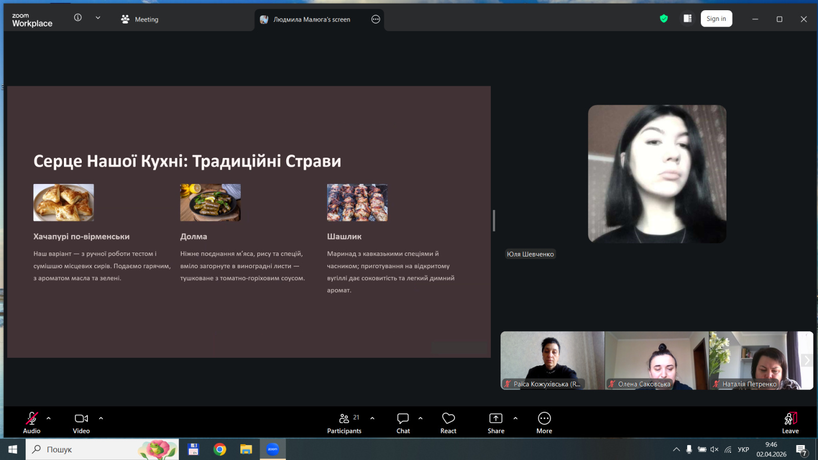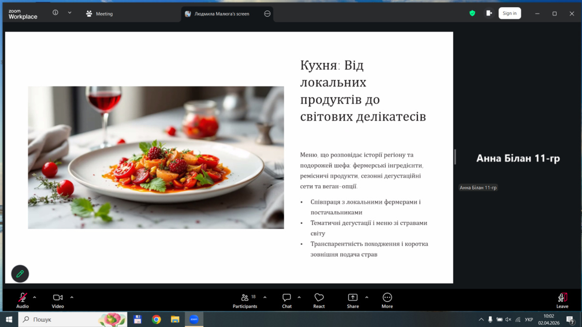 Особлива увага була приділена етно-туризму та автентиці. Болотенюк Олександра та Подзігун Яна (11-тм) представили проєкти сільських зелених садиб, що актуалізує розвиток внутрішнього туризму. Гастрономічний напрям був представлений ресторанами європейської кухні (Козяревич Ангеліна), кавказької (Оберемченко Єлизавета) та вірменської (Шевченко Юлія). Також свої напрацювання презентували Онипчук Анастасія та Білан Анна.