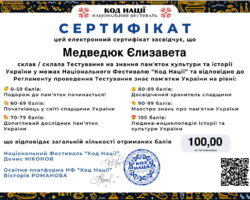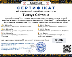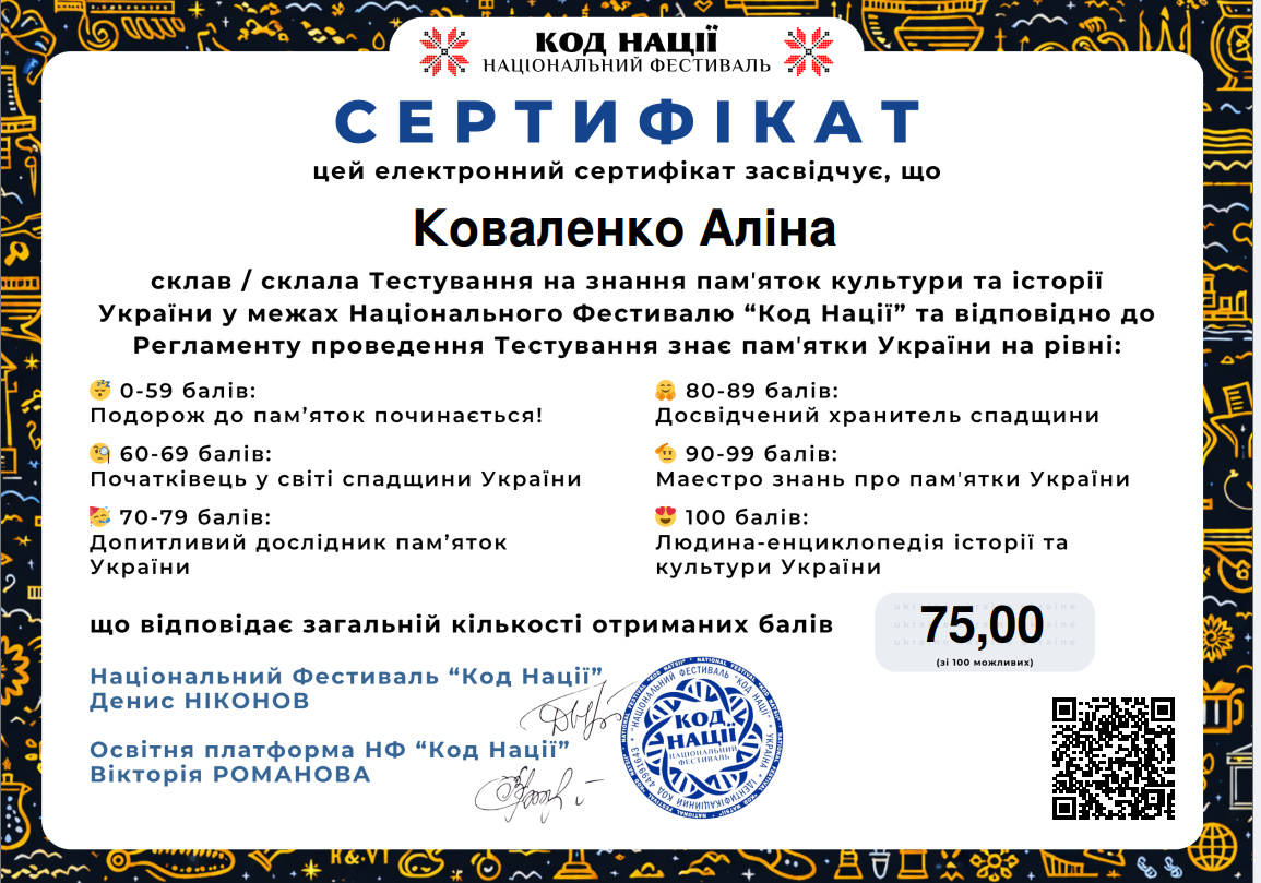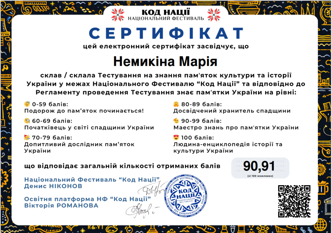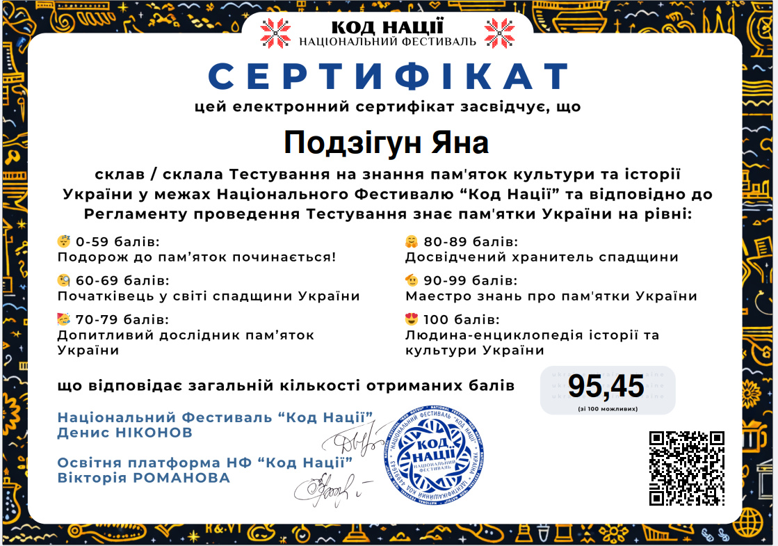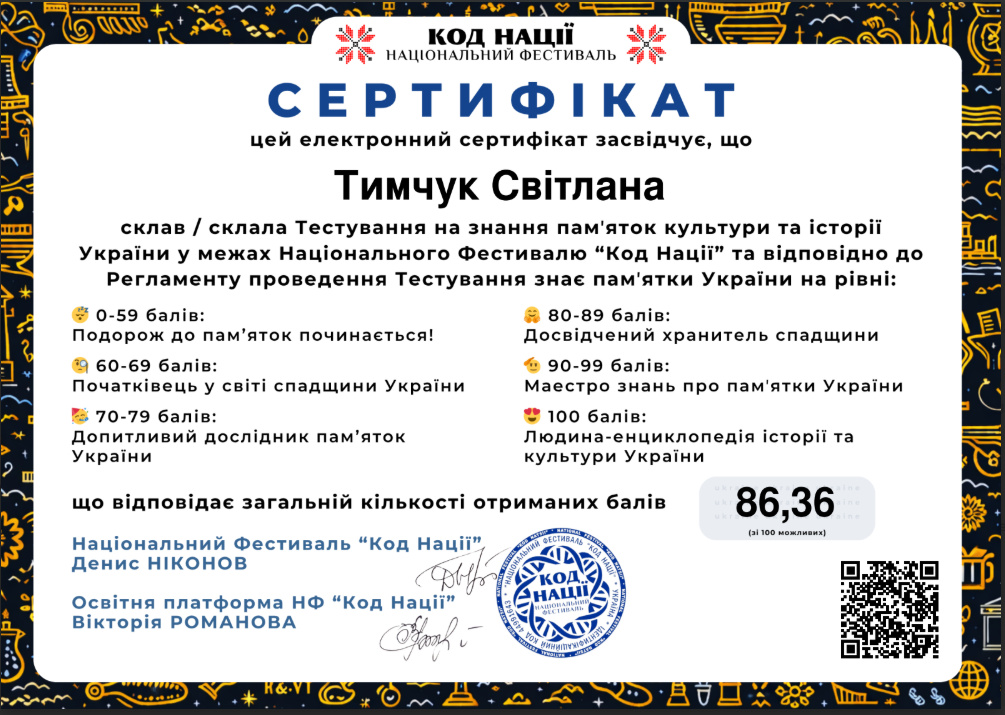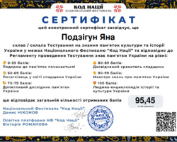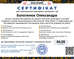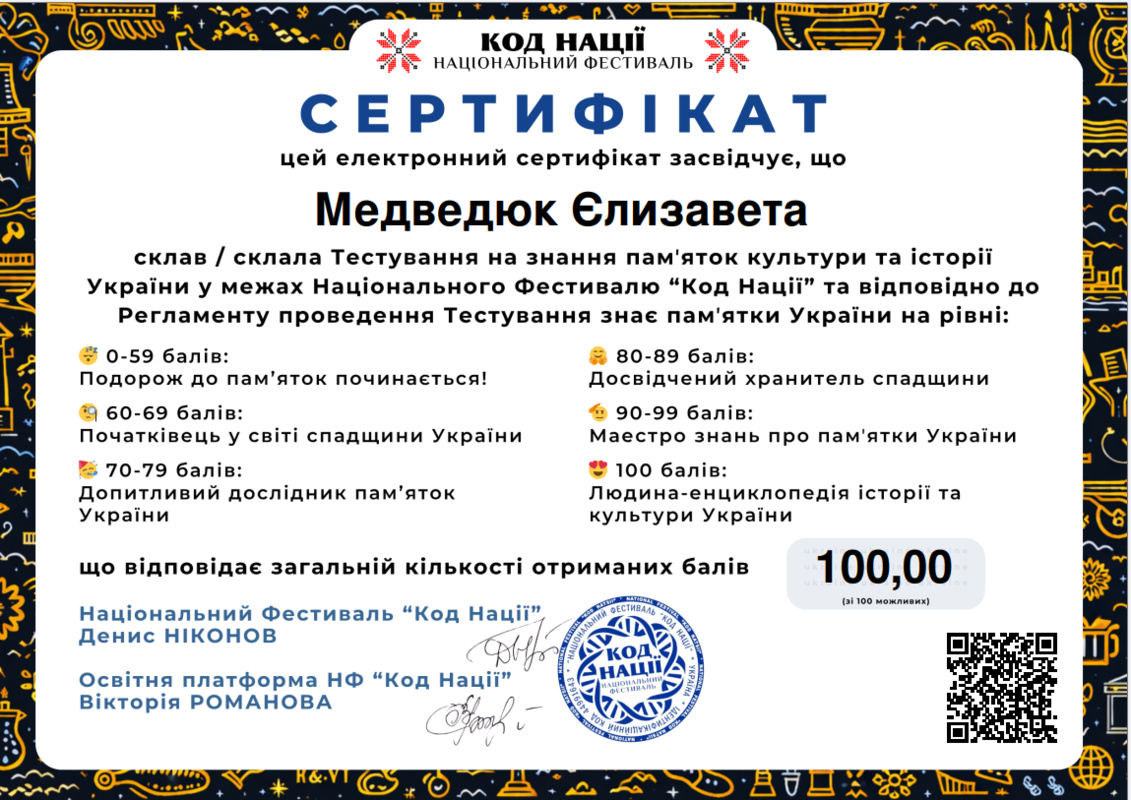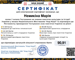 Такий результат відповідає найвищому рівню – «Людина-енциклопедія історії та культури України», що свідчить про глибокі знання, високий рівень ерудиції та професійну зацікавленість у сфері культурної спадщини.