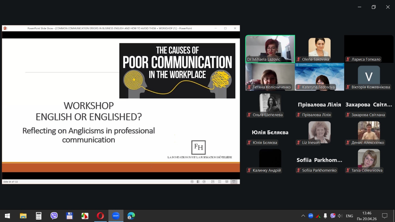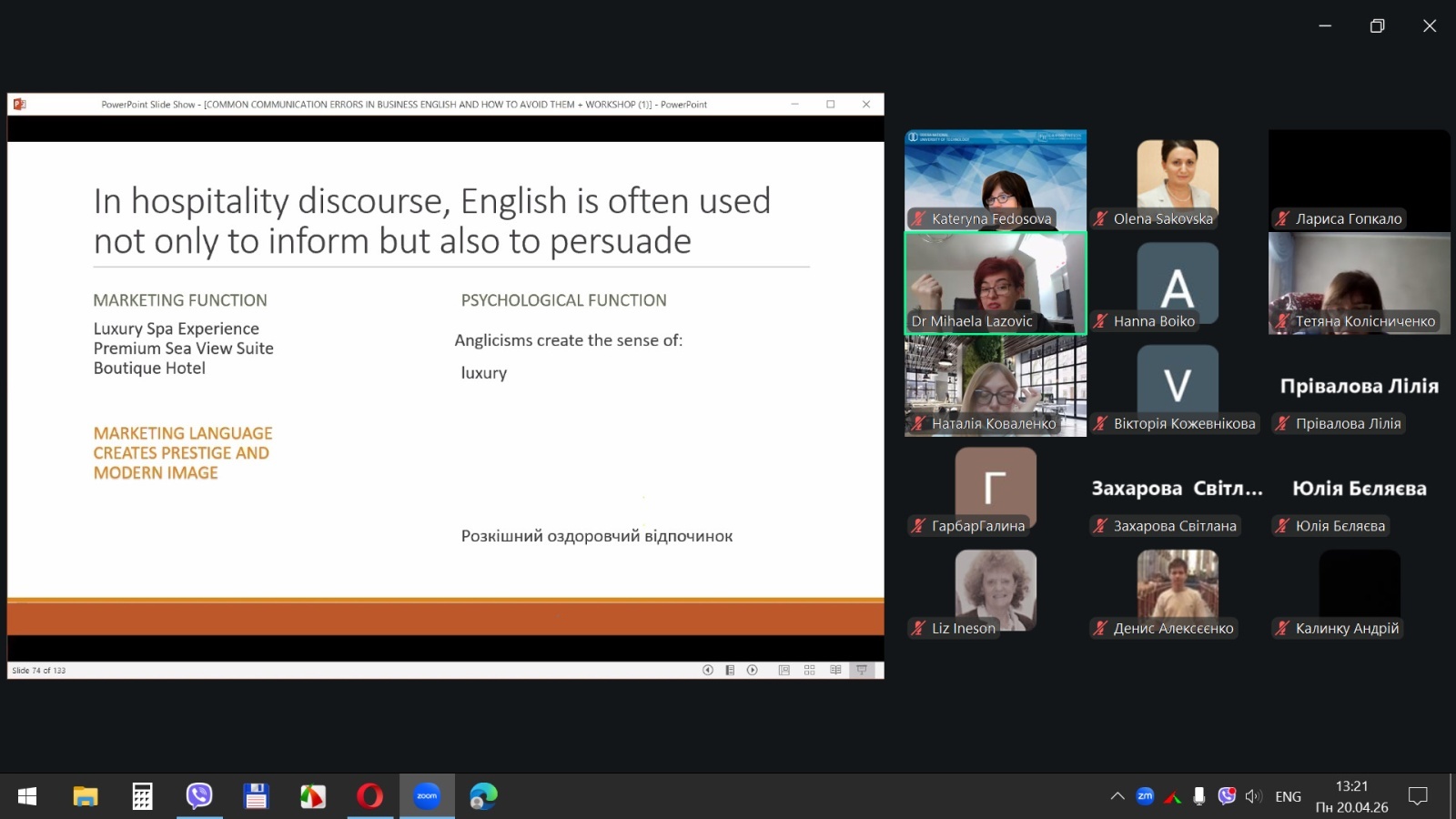 Вебінар був присвячений найпоширенішим помилкам у діловій англійській мові, з якими стикаються фахівці сфери гостинності у професійному спілкуванні, та став ефективною платформою для обговорення найтиповіших мовних труднощів, аналізу реальних ситуацій професійної взаємодії та пошуку шляхів їх подолання. Учасники дізнались, як уникати цих помилок та покращити свою комунікацію з клієнтами і партнерами в міжнародному середовищі.