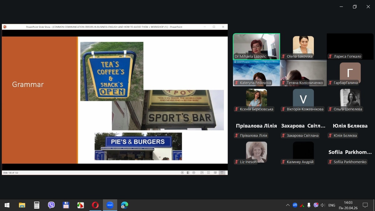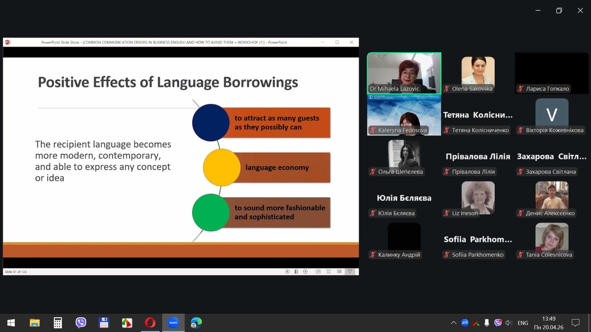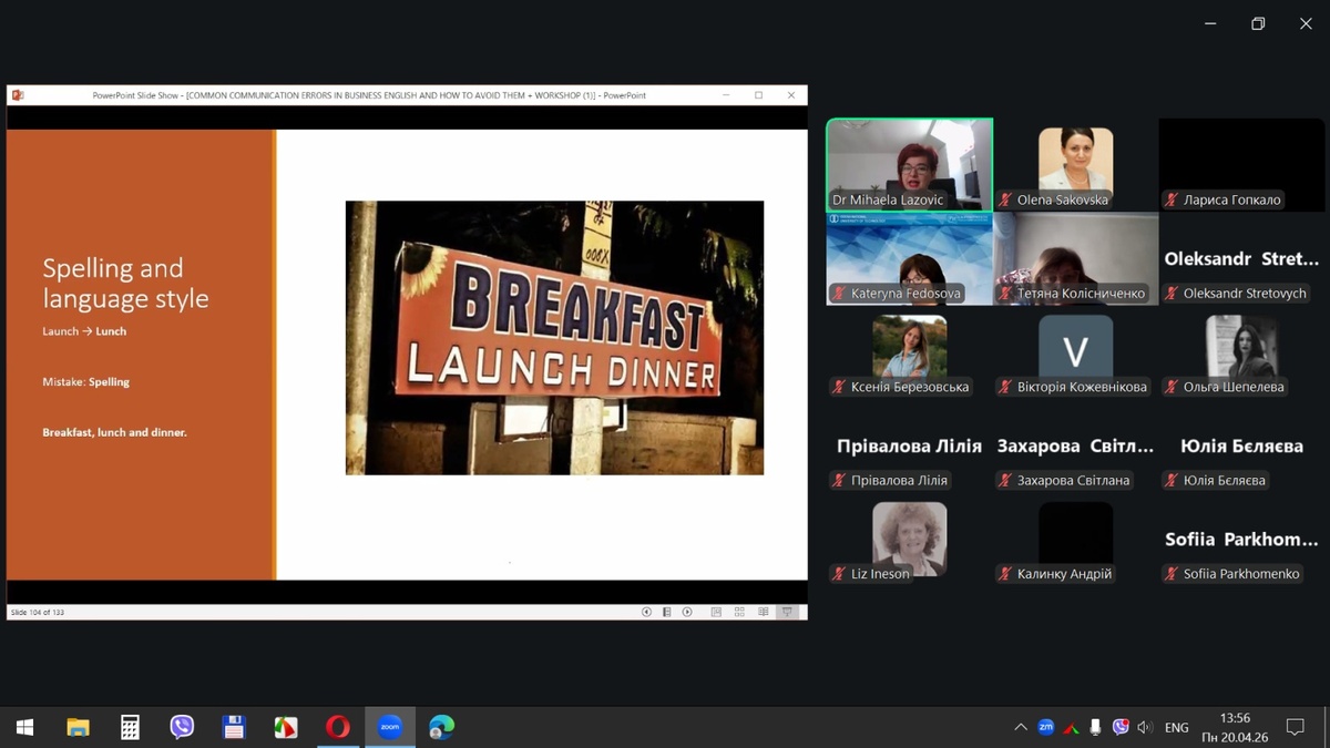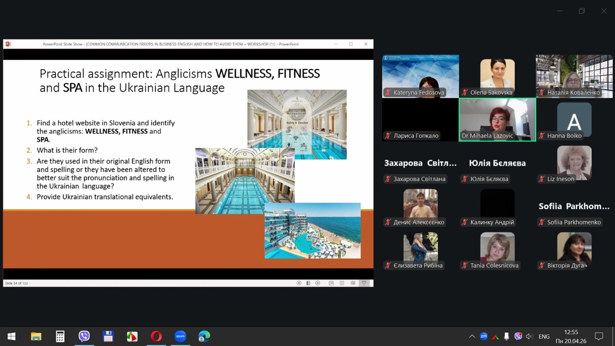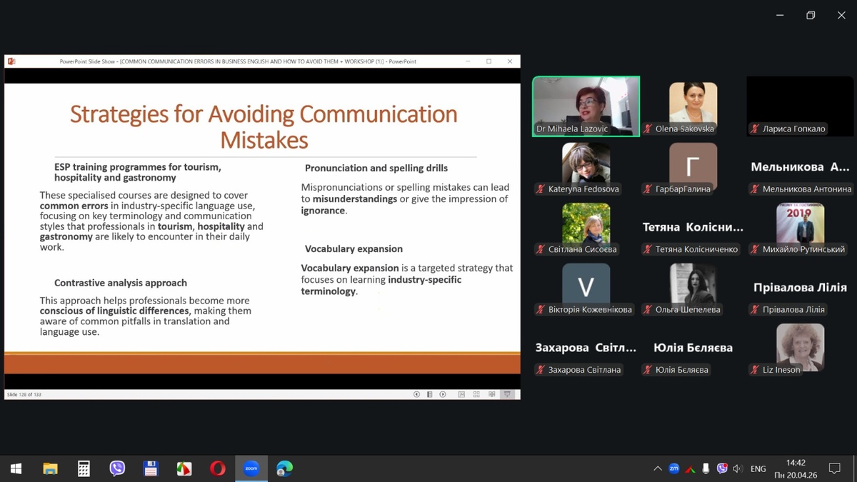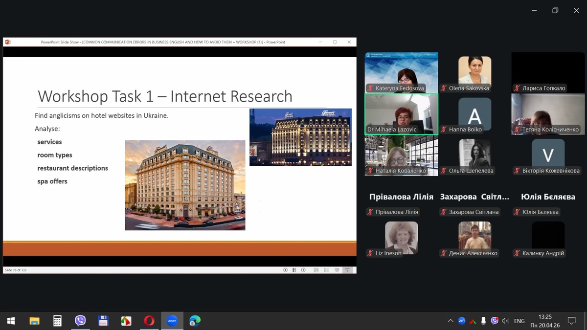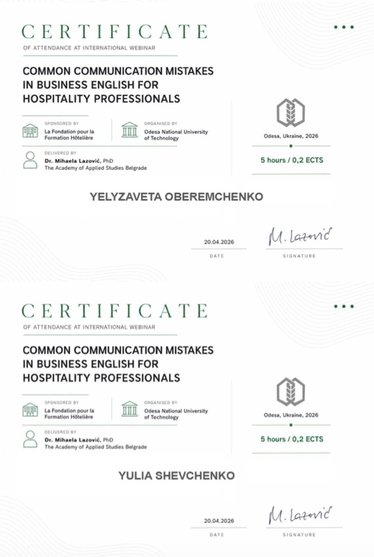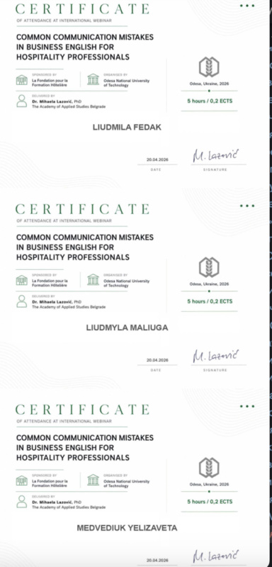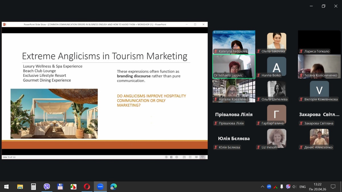 20 квітня 2026 року здобувачі вищої освіти спеціальностей «Готельно-ресторанна справа та кейтеринг», «Туризм та рекреація» та науково-педагогічні працівники кафедри туризму та готельно-ресторанної справи Уманського національного університету взяли участь у міжнародному вебінарі «Поширені помилки у спілкуванні діловою англійською мовою для фахівців індустрії гостинності» на англійській мові.