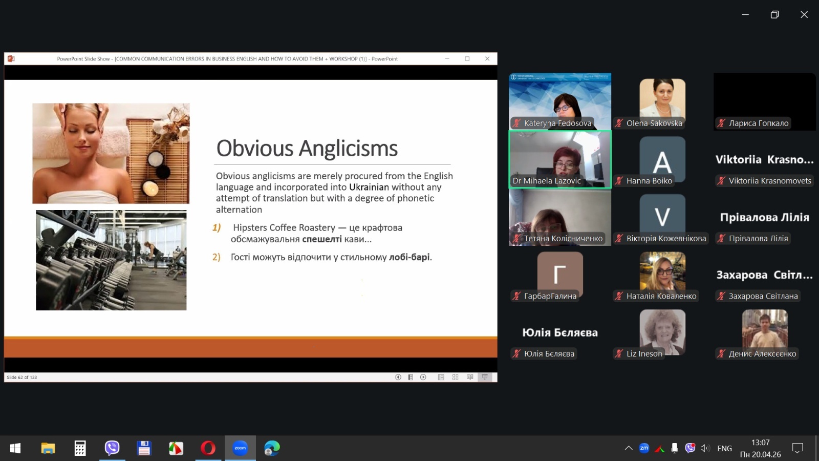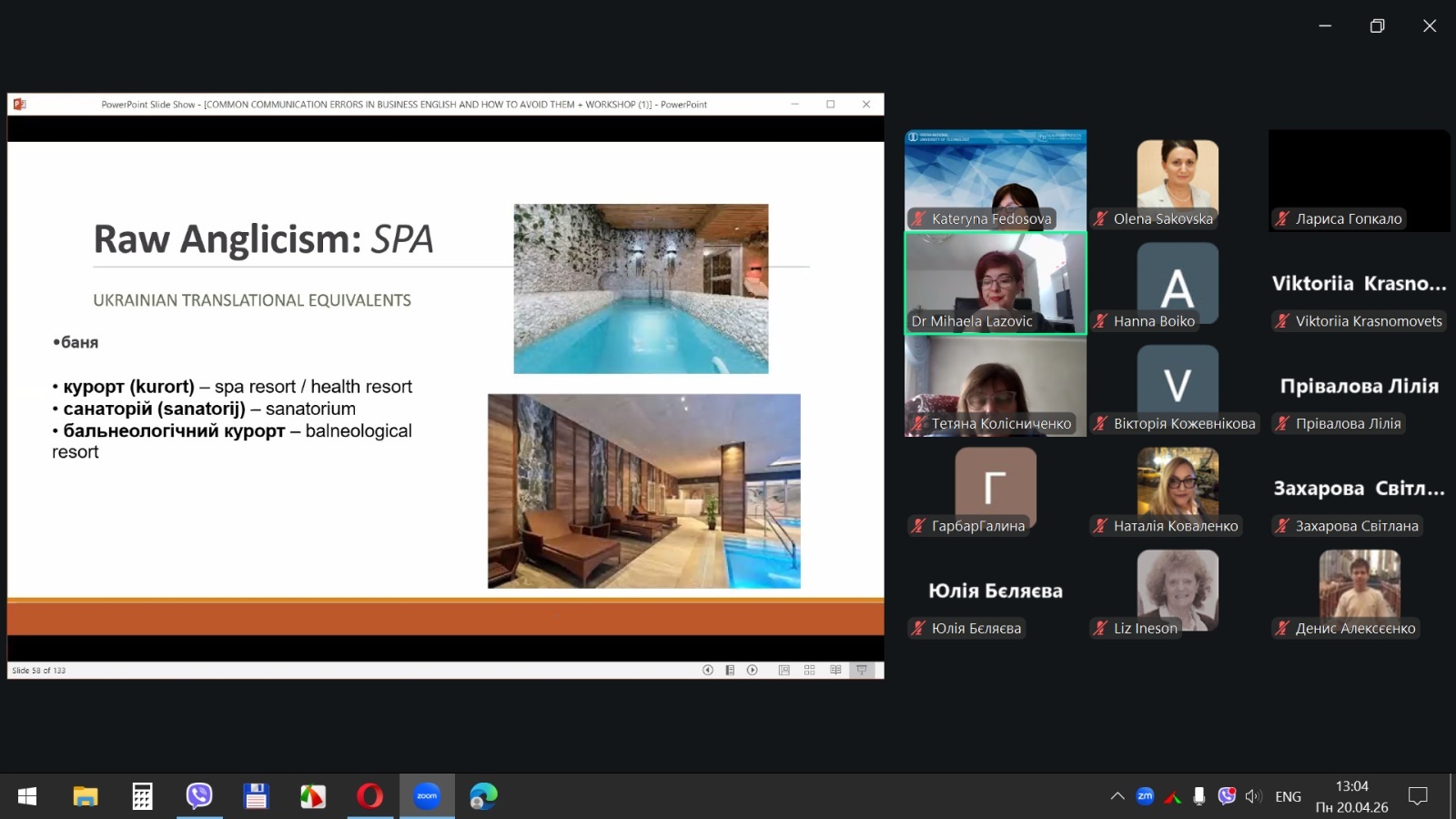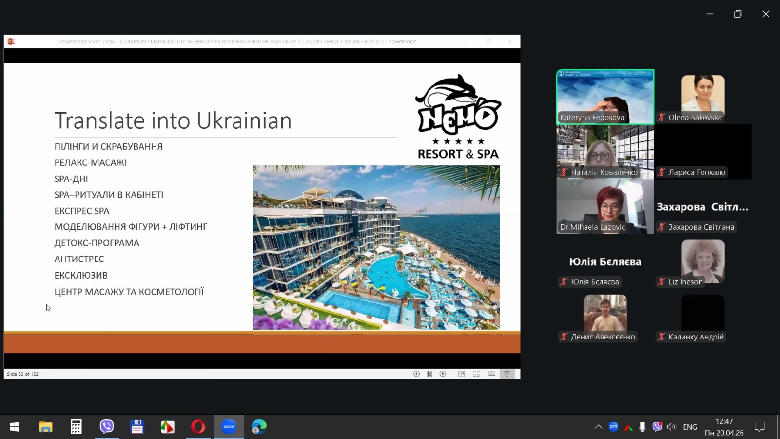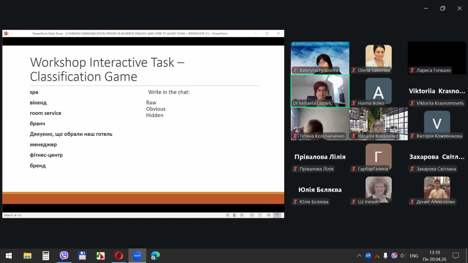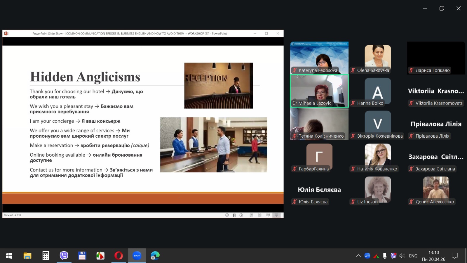 20 квітня 2026 року здобувачі вищої освіти спеціальностей «Готельно-ресторанна справа та кейтеринг», «Туризм та рекреація» та науково-педагогічні працівники кафедри туризму та готельно-ресторанної справи Уманського національного університету взяли участь у міжнародному вебінарі «Поширені помилки у спілкуванні діловою англійською мовою для фахівців індустрії гостинності» на англійській мові.