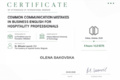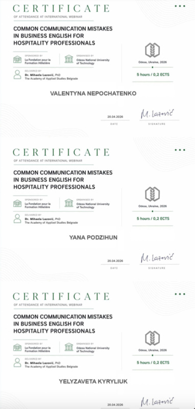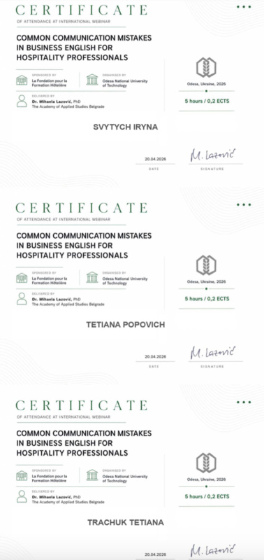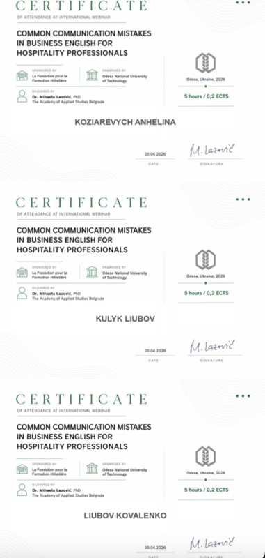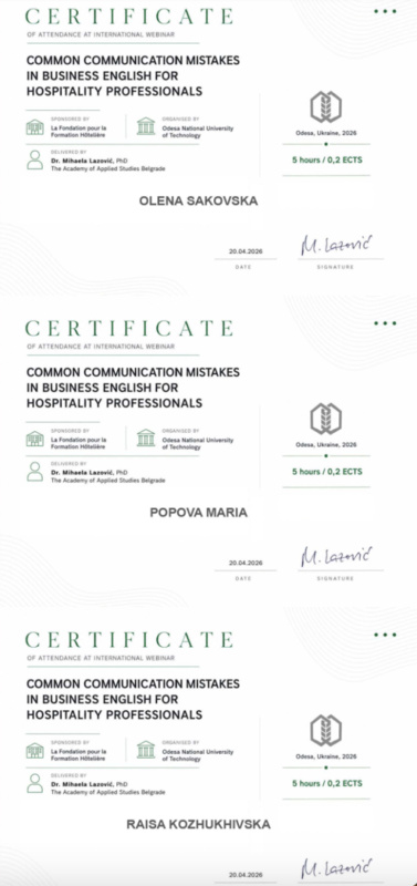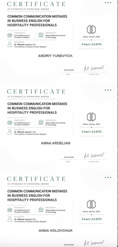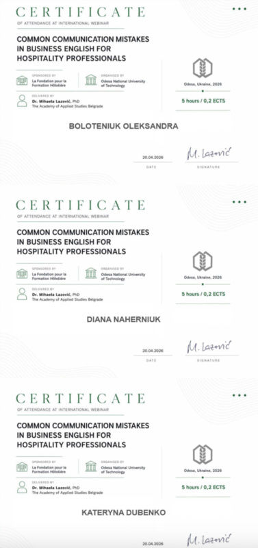 Учасники вебінару отримали цифрові сертифікати міжнародного зразка, які підтверджують набуті компетентності та підвищення кваліфікації, професійний розвиток у напрямі міжкультурної комунікації у сфері гостинності.