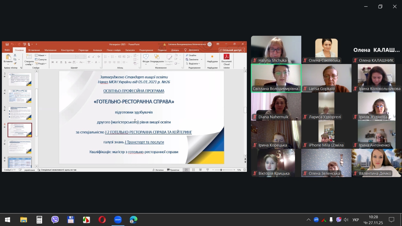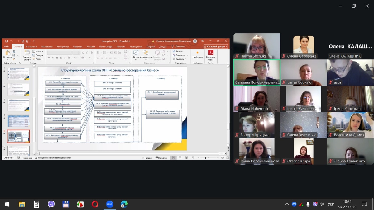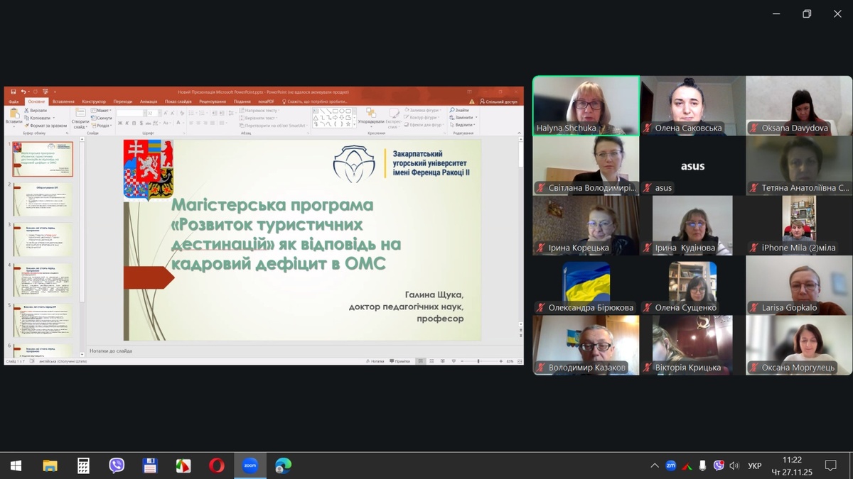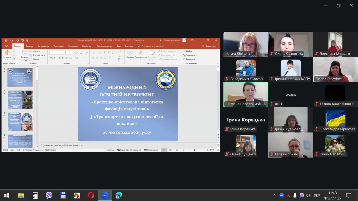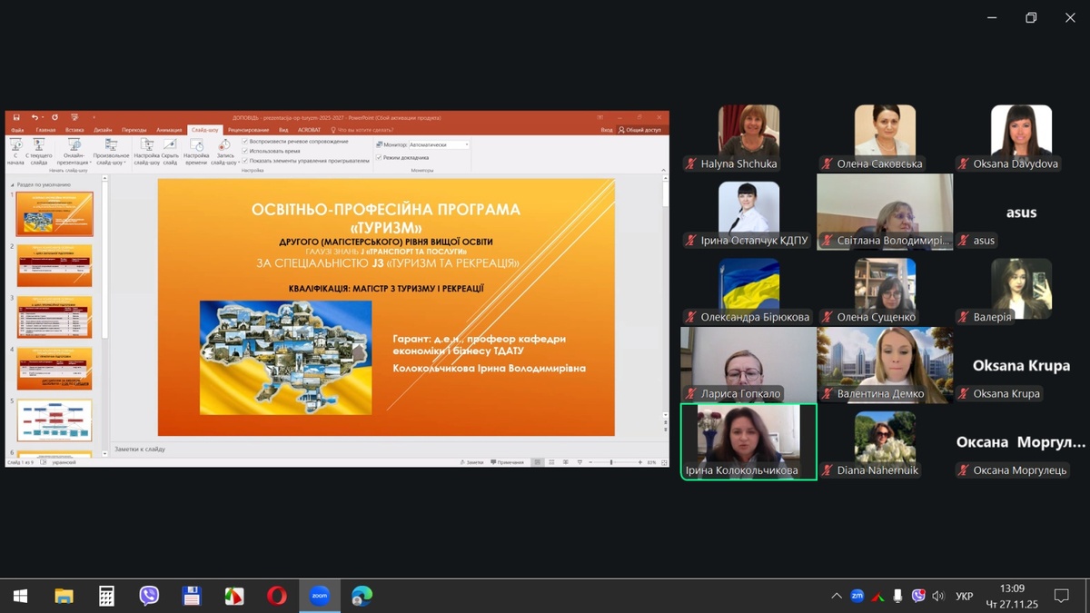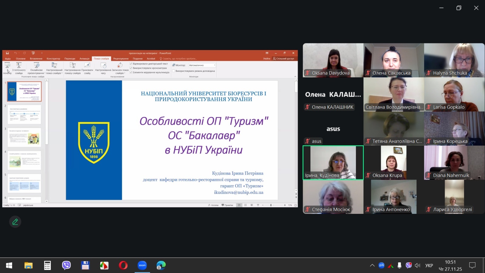 Викладачі кафедри туризму та готельно-ресторанної справи Уманського національного університету взяли активну участь у Міжнародному освітньому нетворкінгу «Практико-орієнтована підготовка фахівців галузі знань J “Транспорт та послуги”: реалії та виклики», який відбувся 27 листопада 2025 року в онлайн-форматі. Захід був організований кафедрою готельно-ресторанної справи та туризму економічного факультету Національного університету біоресурсів і природокористування України.