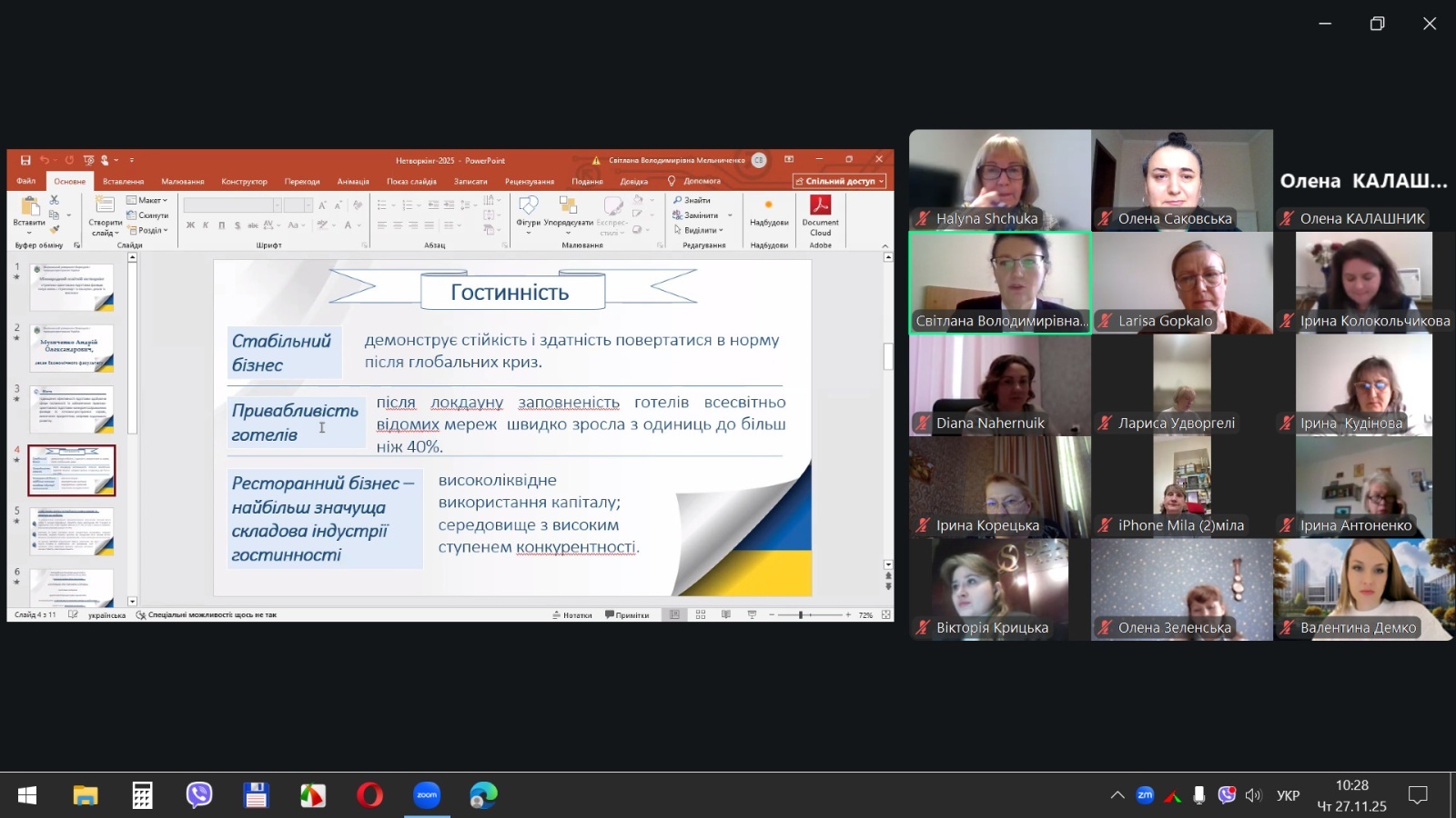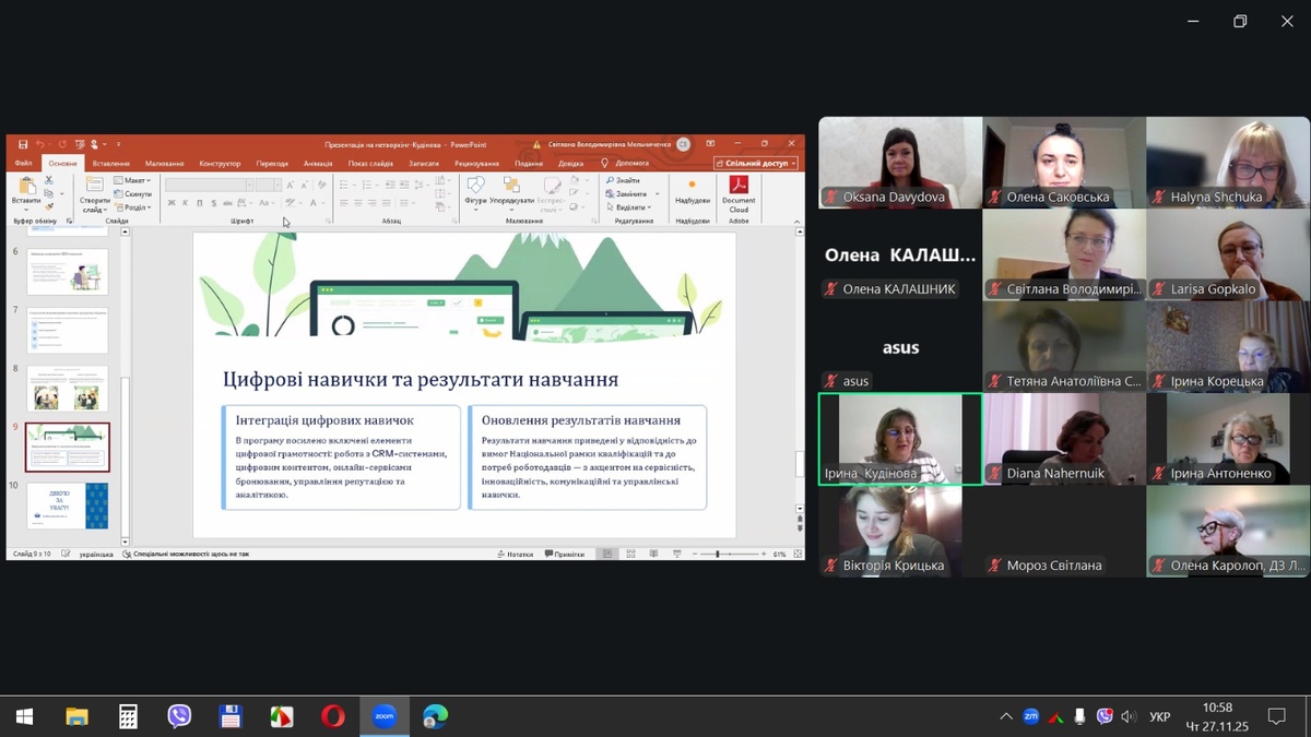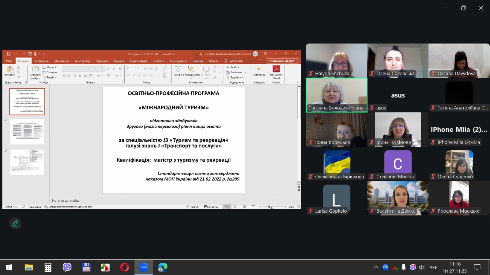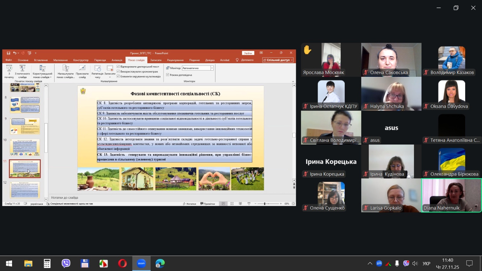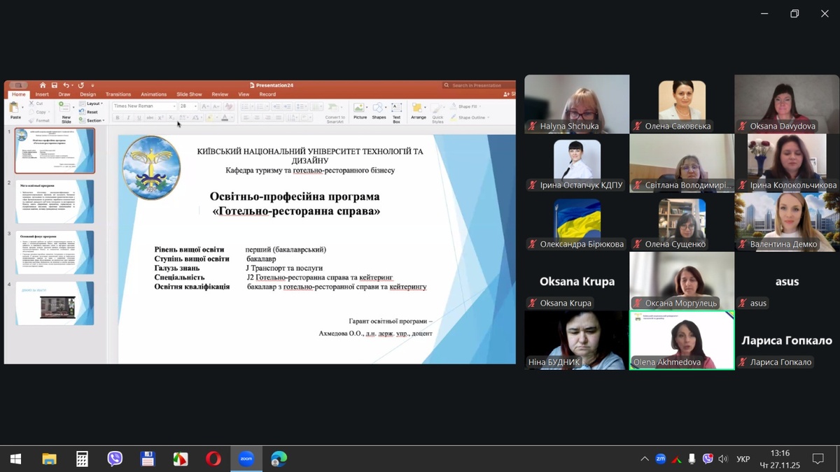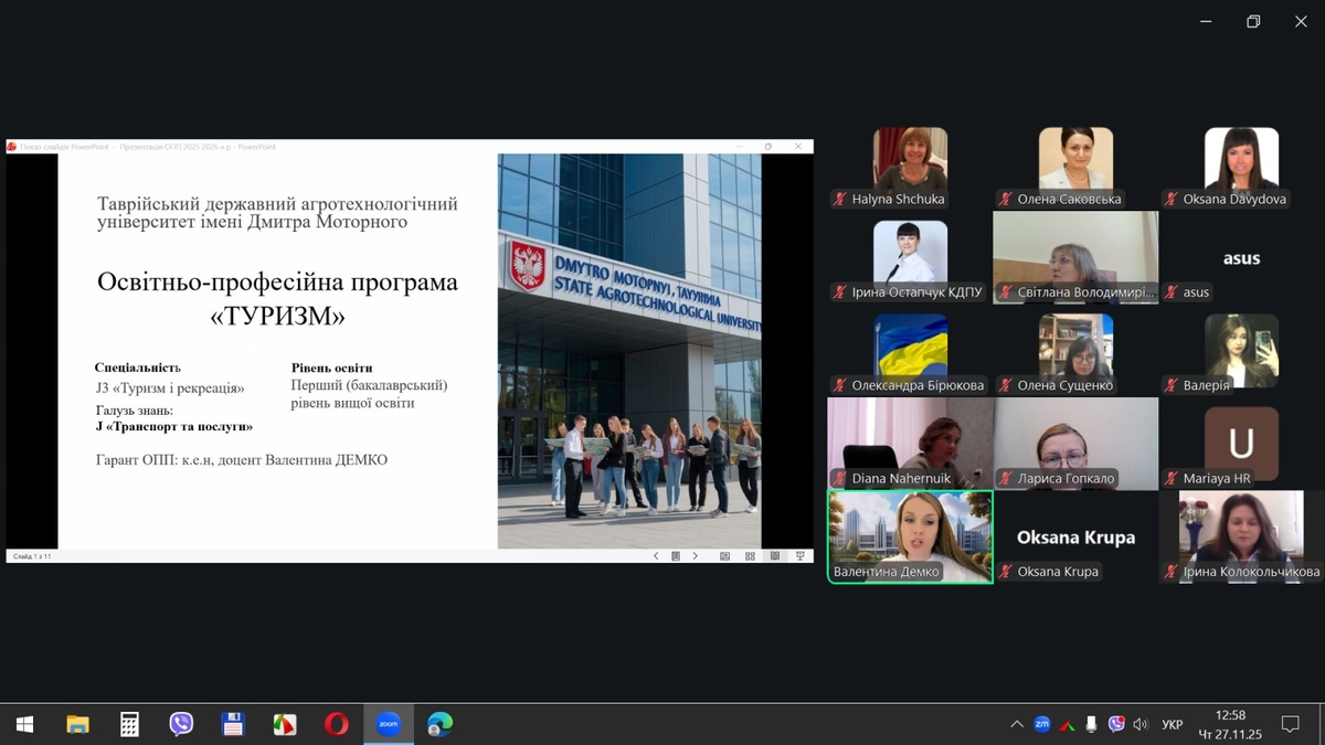 Викладачі кафедри туризму та готельно-ресторанної справи Уманського національного університету взяли активну участь у Міжнародному освітньому нетворкінгу «Практико-орієнтована підготовка фахівців галузі знань J “Транспорт та послуги”: реалії та виклики», який відбувся 27 листопада 2025 року в онлайн-форматі. Захід був організований кафедрою готельно-ресторанної справи та туризму економічного факультету Національного університету біоресурсів і природокористування України.