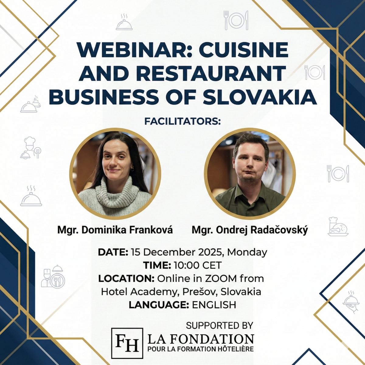 Лекторами були Mgr. Ondrej Radačovský та Mgr. Dominika Franková, які вели онлайн-трансляцію з Hotel Academy, Пряшів, Словаччина. Захід проводився за підтримки La Fondation pour la Formation Hôtelière (Швейцарія). Модератором семінару була експерт у сфері ресторанного бізнесу, кандидат технічних наук, доцент Одеського національного технологічного університету Катерина ФЕДОСОВА.