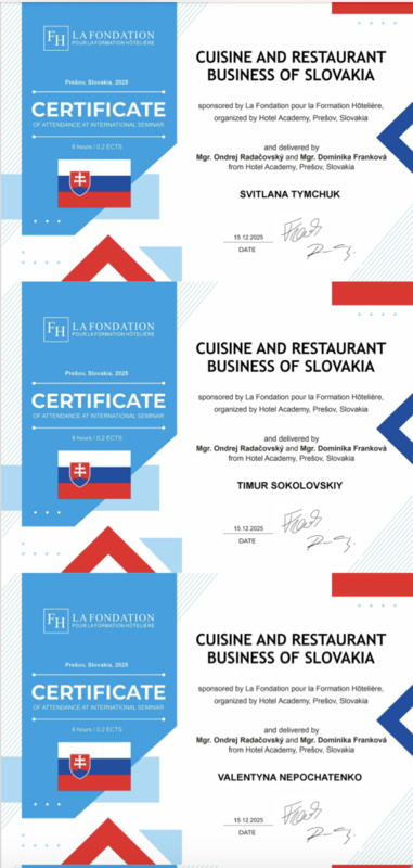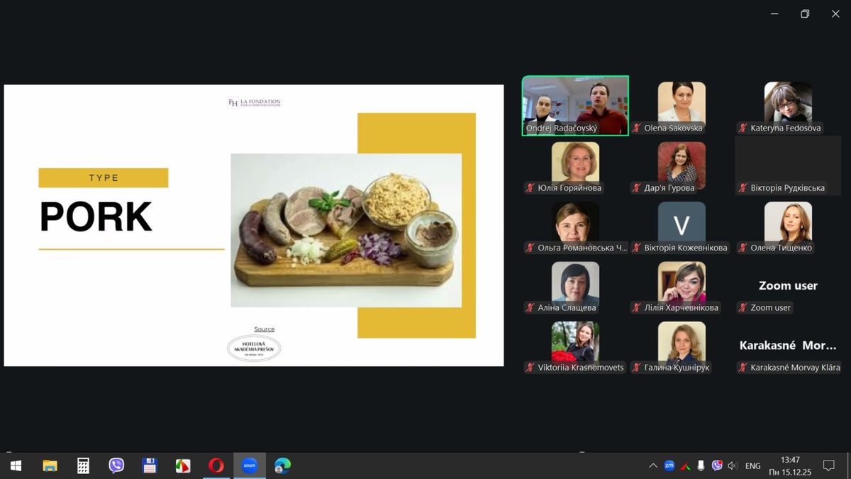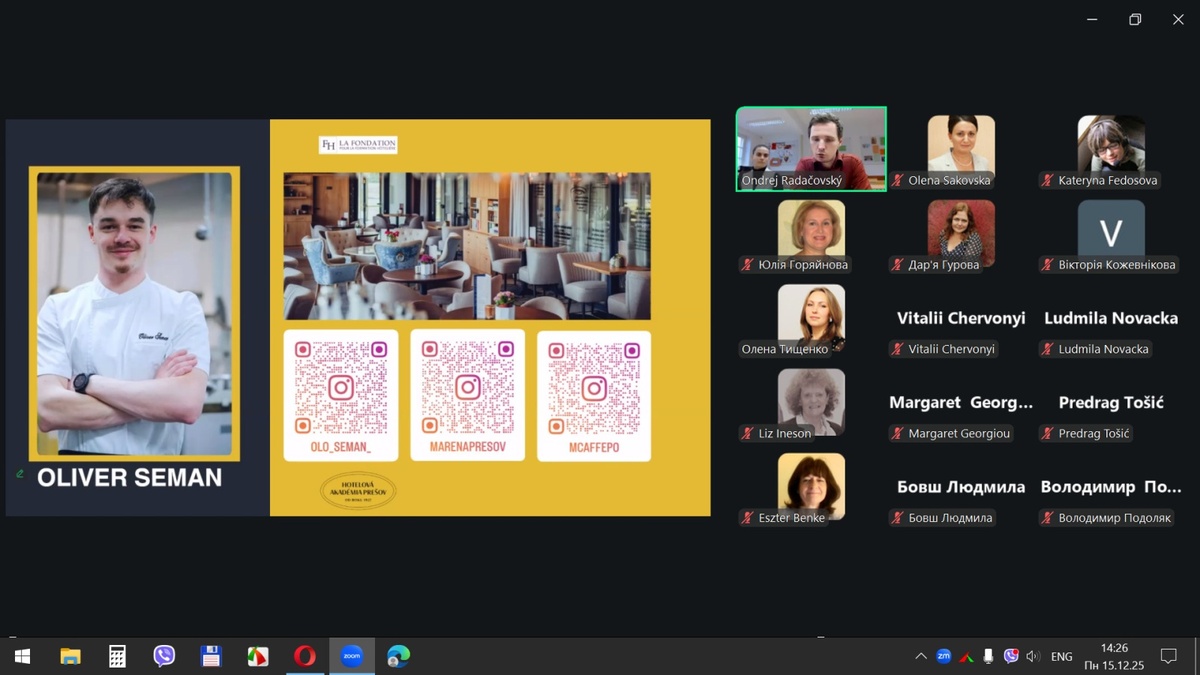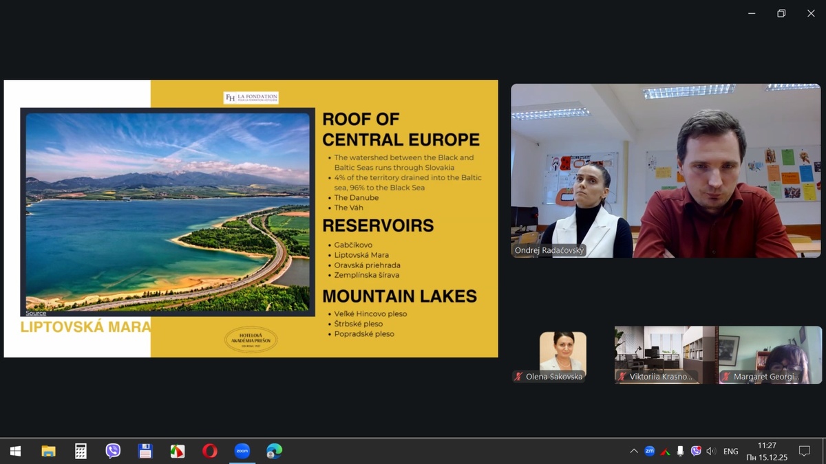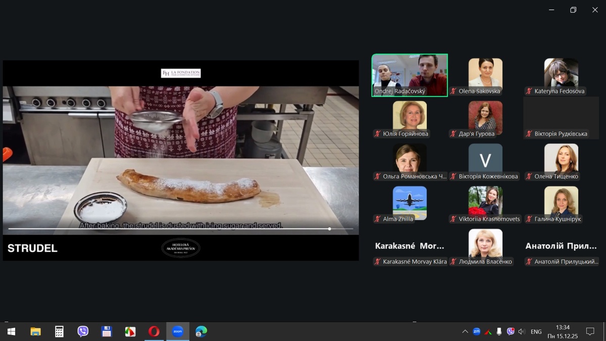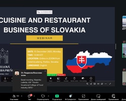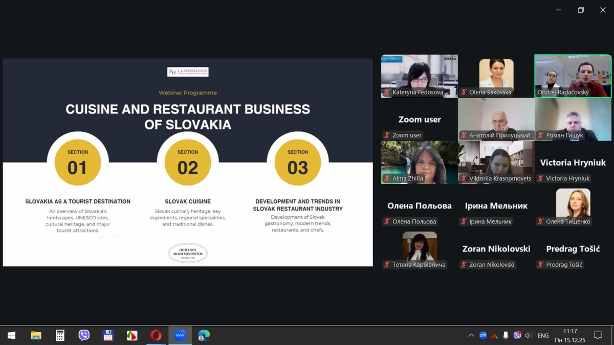 15 грудня 2025 року здобувачі вищої освіти спеціальностей «Готельно-ресторанна справа та кейтеринг», «Туризм та рекреація» та науково-педагогічні працівники кафедри туризму та готельно-ресторанної справи Уманського національного університету взяли участь у міжнародному вебінарі «Кухня та ресторанний бізнес Словаччини» на англійській мові, який став цінним ресурсом для здобувачів освіти та викладачів, зацікавлених у поглибленні знань у сфері гостинності та ведення ресторанного господарства.