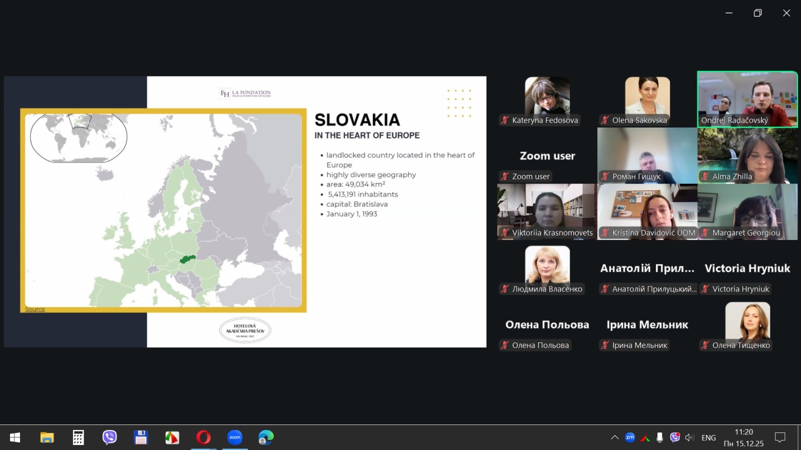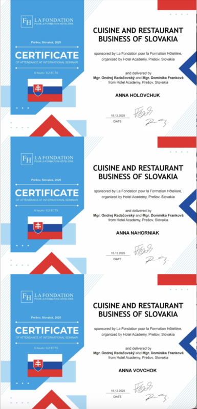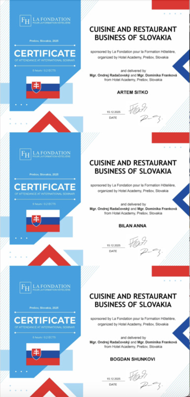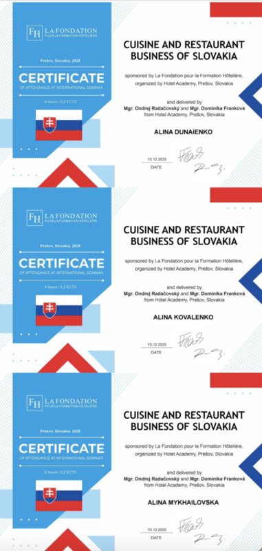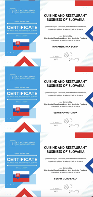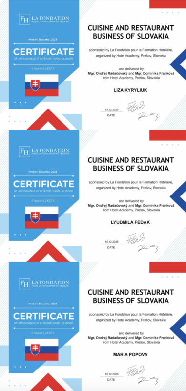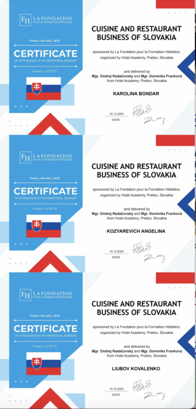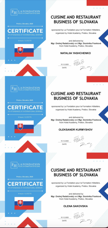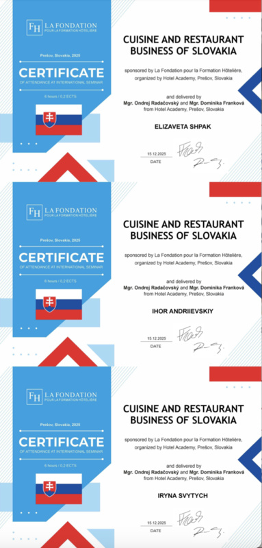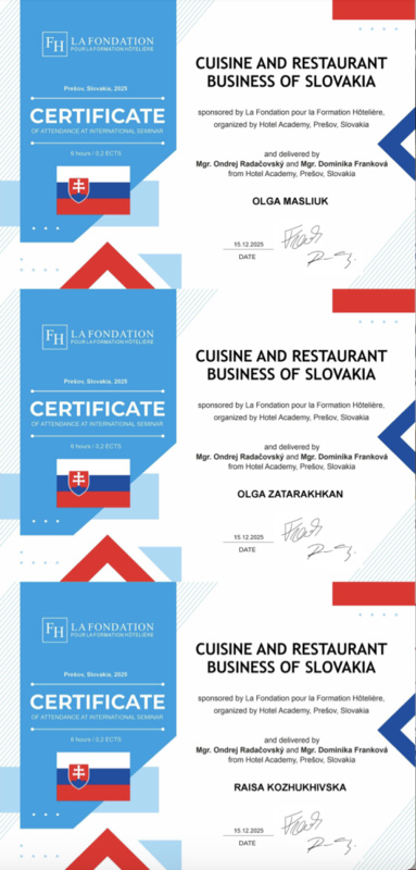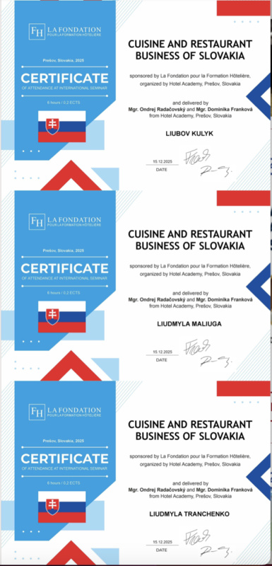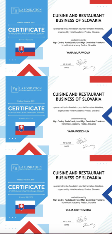 15 грудня 2025 року здобувачі вищої освіти спеціальностей «Готельно-ресторанна справа та кейтеринг», «Туризм та рекреація» та науково-педагогічні працівники кафедри туризму та готельно-ресторанної справи Уманського національного університету взяли участь у міжнародному вебінарі «Кухня та ресторанний бізнес Словаччини» на англійській мові, який став цінним ресурсом для здобувачів освіти та викладачів, зацікавлених у поглибленні знань у сфері гостинності та ведення ресторанного господарства.