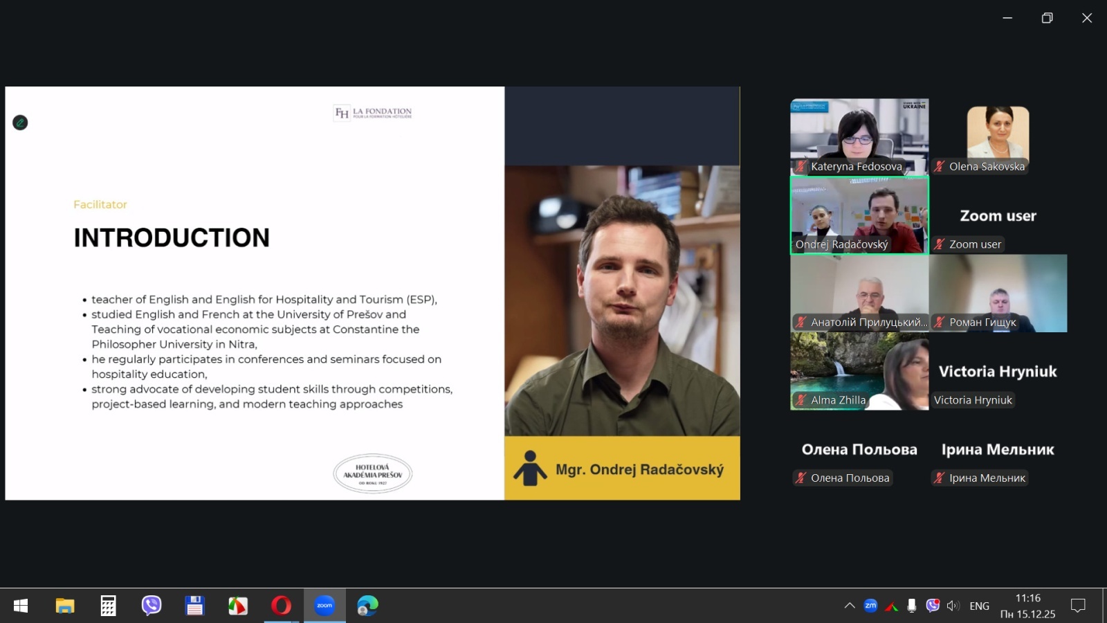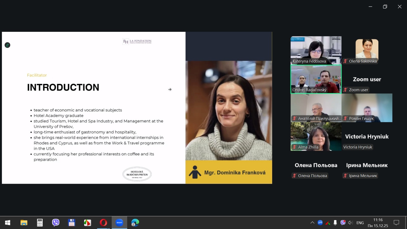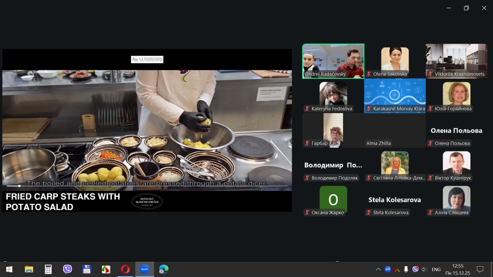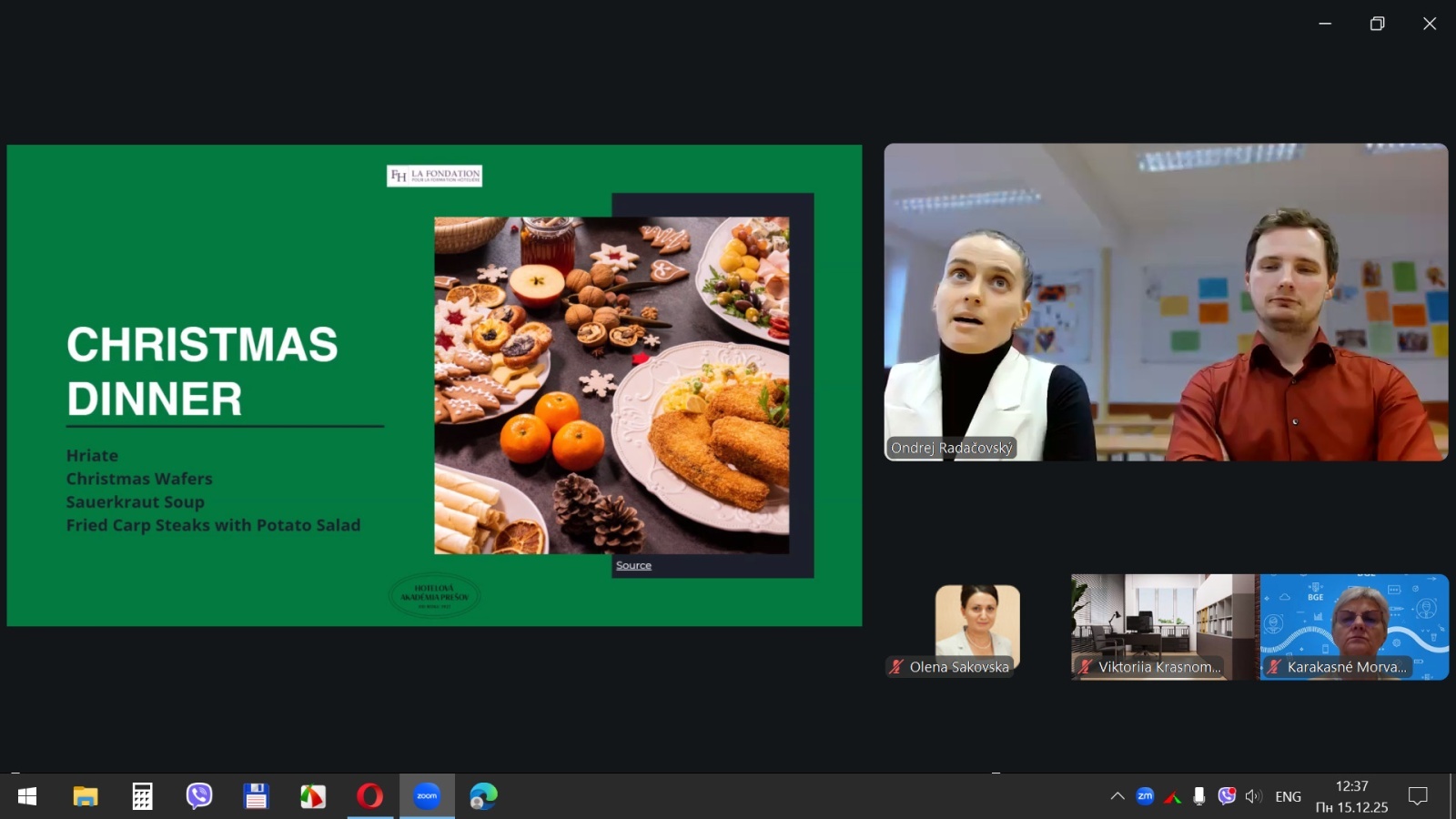 15 грудня 2025 року здобувачі вищої освіти спеціальностей «Готельно-ресторанна справа та кейтеринг», «Туризм та рекреація» та науково-педагогічні працівники кафедри туризму та готельно-ресторанної справи Уманського національного університету взяли участь у міжнародному вебінарі «Кухня та ресторанний бізнес Словаччини» на англійській мові, який став цінним ресурсом для здобувачів освіти та викладачів, зацікавлених у поглибленні знань у сфері гостинності та ведення ресторанного господарства.