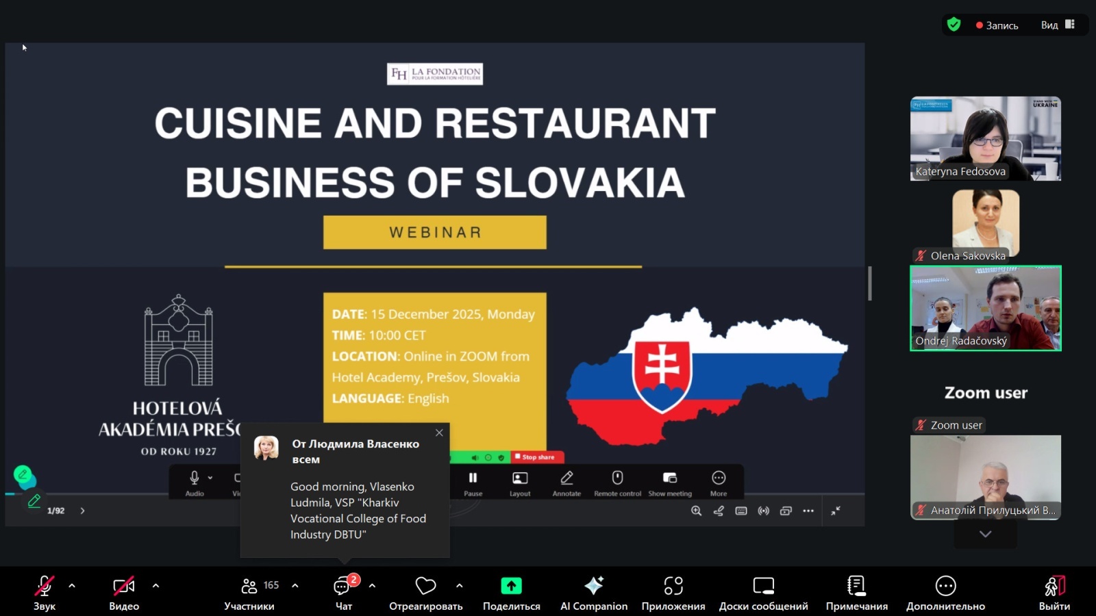 Учасники вебінару дізналися про Словаччину як туристичну дестинацію, національну кухню, традиційні страви та сучасні тенденції ресторанної індустрії.