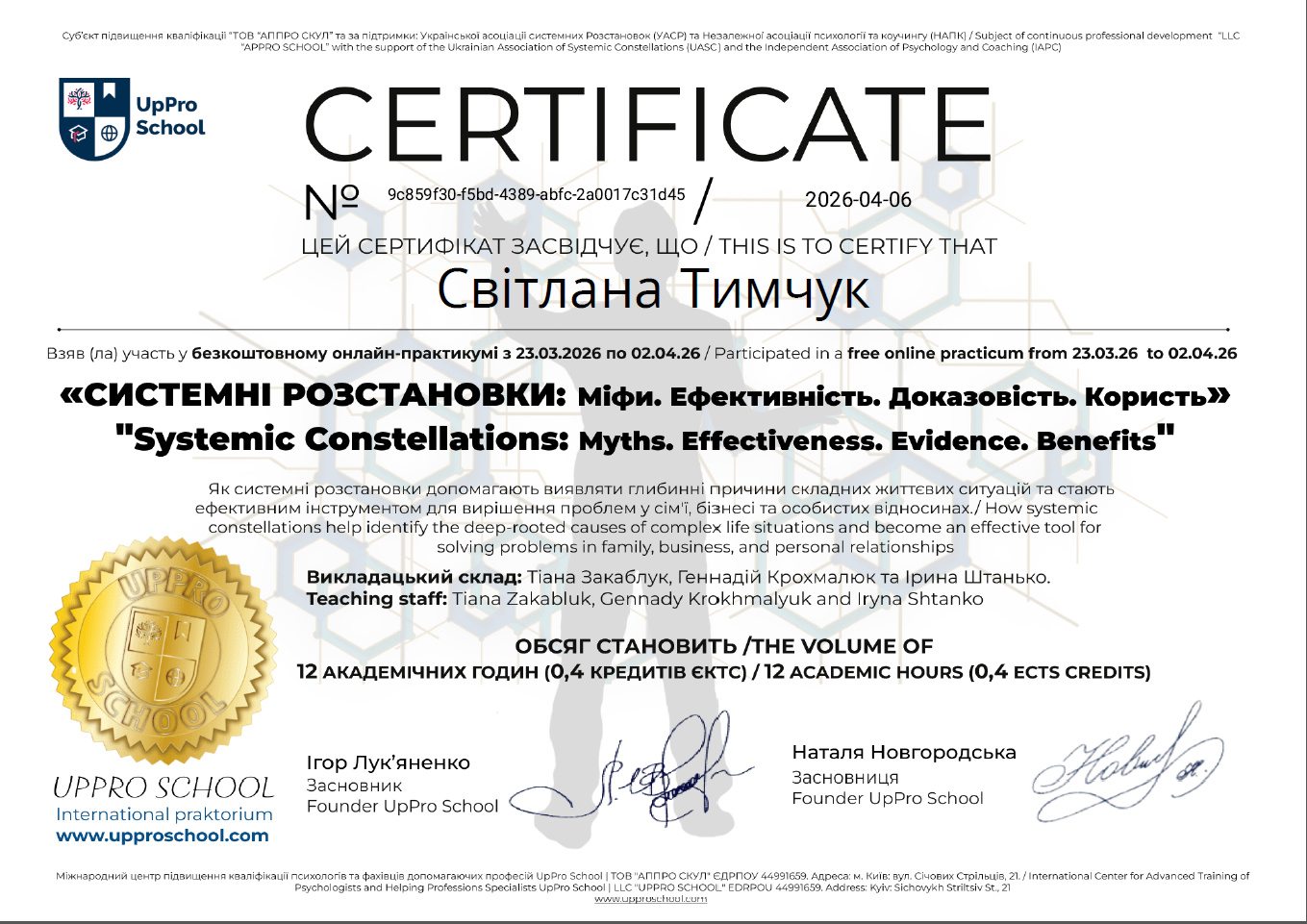 У березні–квітні 2026 року відбувся триденний онлайн-практикум «Системні розстановки: міфи, ефективність, користь та доказовість», організований освітньою платформою UpPro School. Участь у заході взяла Світлана Тимчук доцент кафедри туризму та готельно-ресторанної справи Уманського національного універистету, яка успішно завершила навчання та отримала сертифікат (Сертифікат № 9c859f30-f5bd-4389-abfc-2a0017c31d45 від 6 квітня 2026 р.).