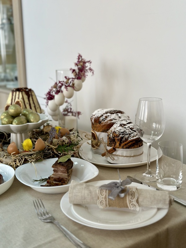 Скатертина (обрус) в українській культурі - це набагато більше, ніж просто елемент декору. Це символ хатнього достатку, порядку та невід’ємна частина сімейних традицій. Свічка є символом світла, віри та воскресіння. Центральним елементом столу є Паска - освячений хліб, що уособлює нове життя і перемогу над смертю. Крашанки та писанки - фарбовані яйця, символ життя і відродження. М’ясні вироби вважалися ознакою заможності та ситого життя. І обовязково на столі має бути сирна страва, це сирна паска (сирна піраміда), що символізує Голгофу - гору, на вершині якої був розп'ятий Христос, а її білий колір - чистоту і Божественне світло.