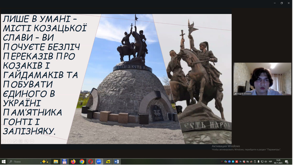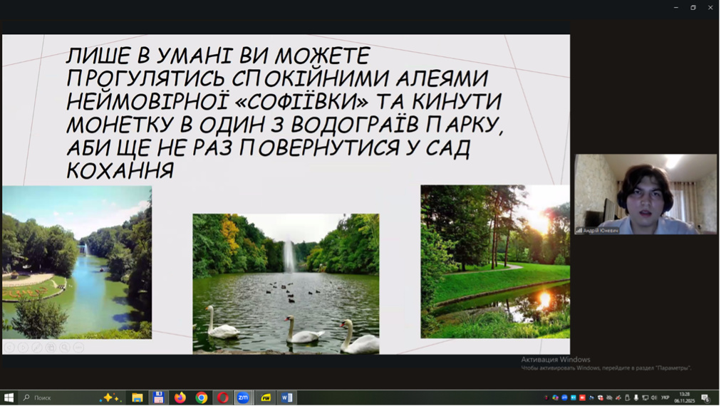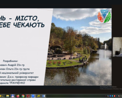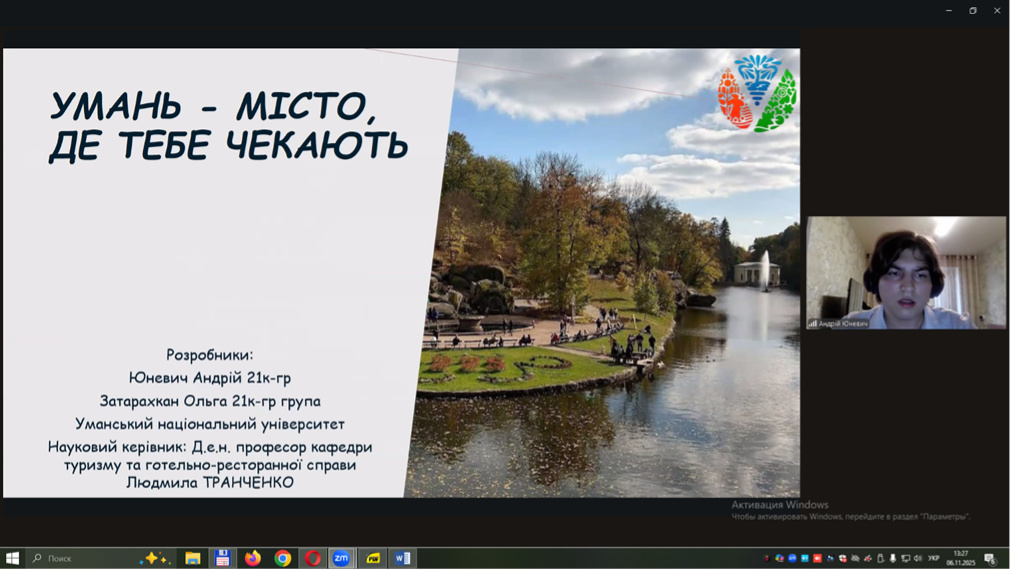 У конкурсі презентацій «Нові туристичні маршрути в Україні» взяла участь команда Уманського національного університету яка представила презентацію «УМАНЬ – МІСТО, ДЕ ТЕБЕ ЧЕКАЮТЬ». Команду представляли здобувачі ЮНЕВИЧ Андрій Леонідович 21к-гр та ЗАТАРАХКАН Ольга Володимирівна 21к-гр група, підготовку яких забезпечила доктор економічних наук, професор Людмили ТРАНЧЕНКО.