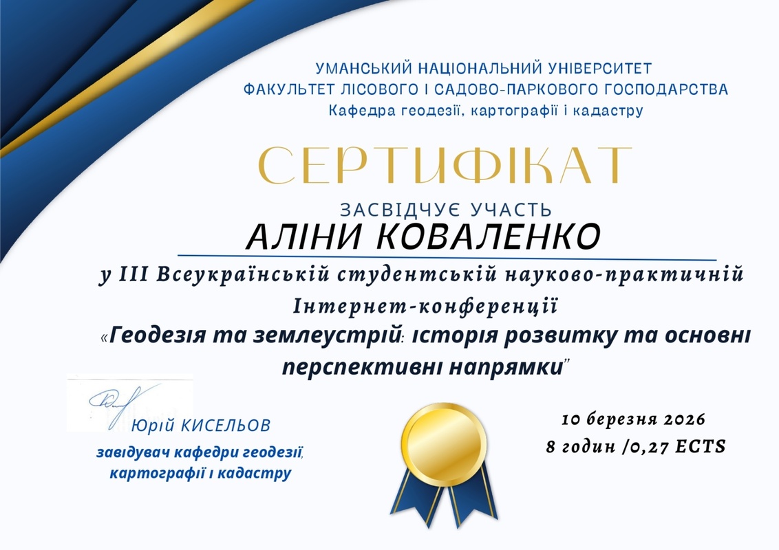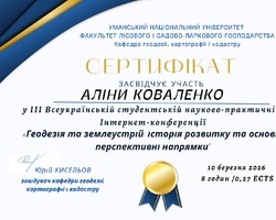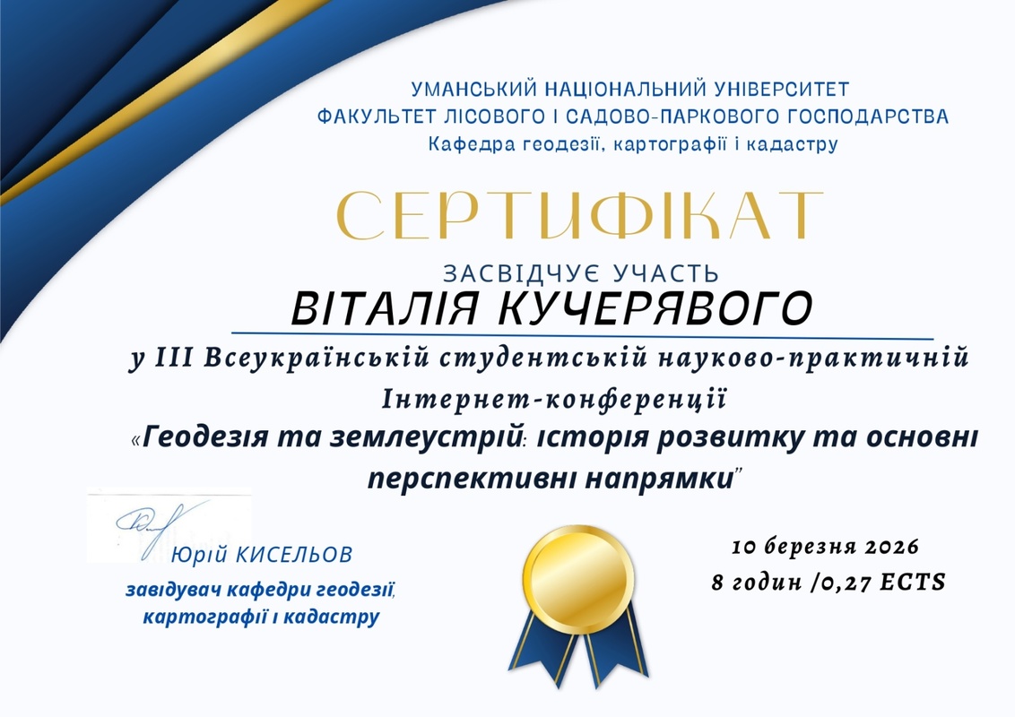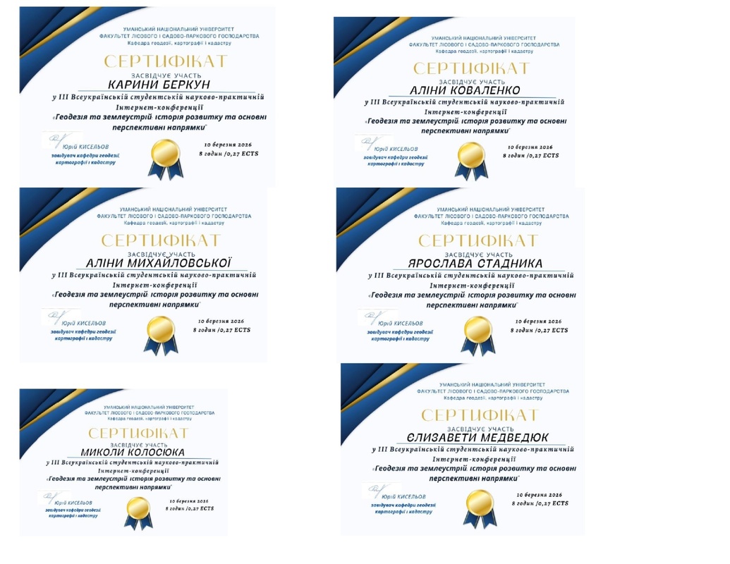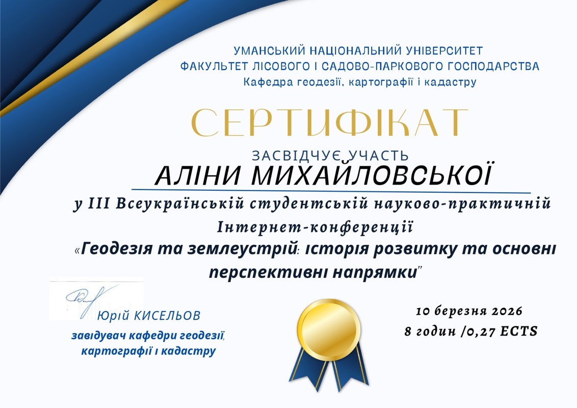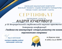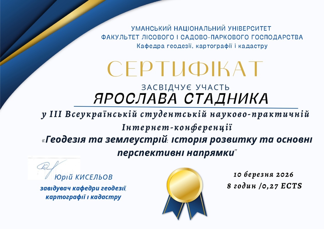 10 березня 2026 року здобувачі вищої освіти, які навчаються за ОПП «Туризм» ОР бакалавр, долучилися до участі в роботі ІІІ Всеукраїнської студентської науково-практичної інтернет-конференції «Геодезія та землеустрій: історія розвитку та основні перспективні напрямки», яка проводилася на базі кафедри геодезії, картографії і кадастру УНУ.