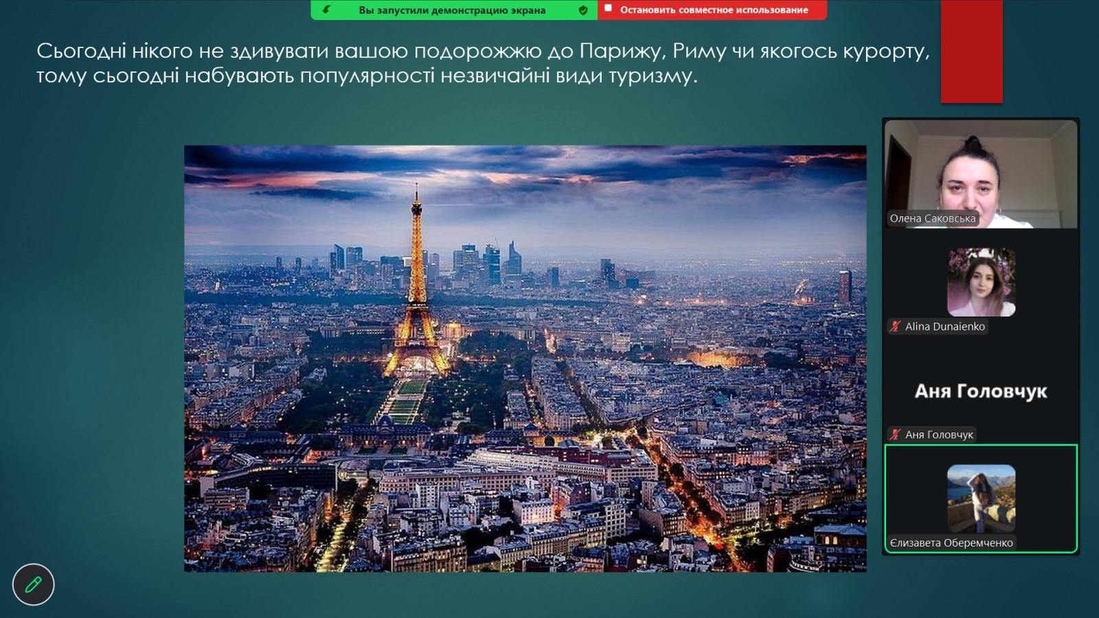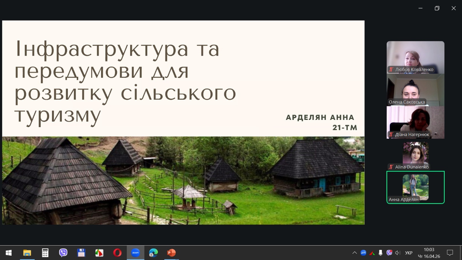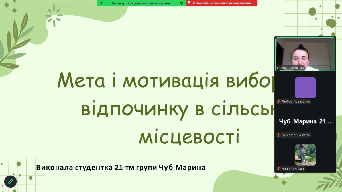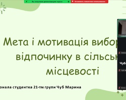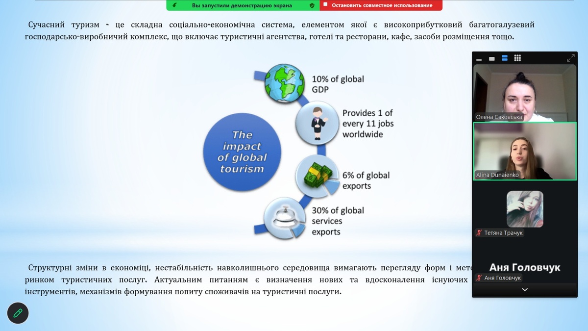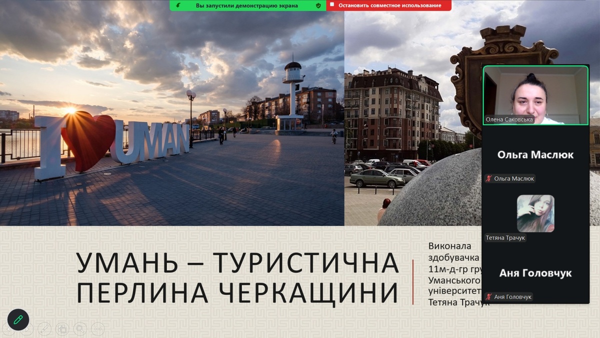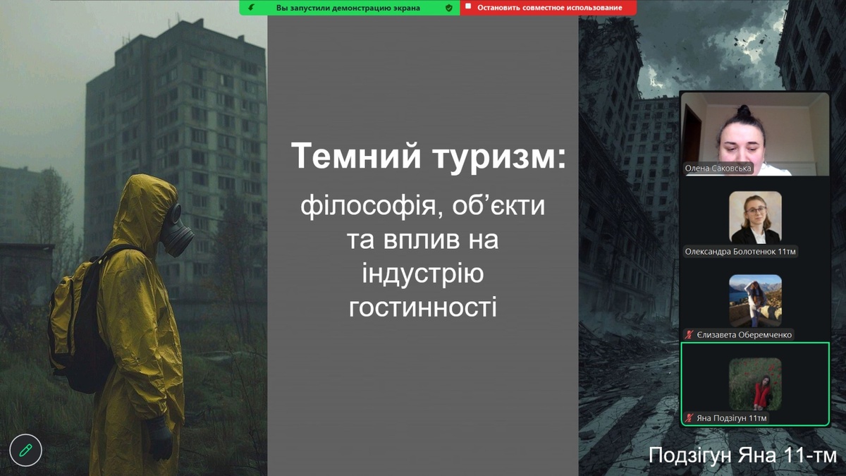 З доповідями-презентаціями на науковій студентській конференції виступили: Аліна Дунаєнко, студентка 11м-тм групи «Управління інноваціями в індустрії туризму та гостинності: міжнародний досвід»; Єлизавета Оберемченко, студентка 31-гр групи «Незвичайні види туризму»; Марина Чуб, студентка 21-тм групи «Мета і мотивація вибору відпочинку в сільській місцевості»; Яна Подзігун, студентка 11-тм групи «Темний туризм: філософія, об’єкти та вплив на індустрію гостинності»; Яна Муравйова, студентка 11-тм групи «Очаків – мій рідний край»; Анна Головчук, студентка 21-тм групи «Глобальні подорожі: як змінюється міжнародний туризм сьогодні»; Олександра Болотенюк, студентка 11-тм групи «Японія: країна сонця, що сходить»; Анна Арделян, студентка 21-тм групи «Інфраструктура та передумови для розвитку сільського туризму»; Юлія Шевченко, студентка 31-тм групи «Організація роботи ресторану вірменської кухні «Arev» в умовах воєнного стану в Україні»; Ангеліна Козяревич, студентка 31-гр групи «Подорожі зі смаком: гастрономічний туризм як новий тренд»; Тетяна Трачук, студентка 11м-д-гр групи «Умань – туристична перлина Черкащини».