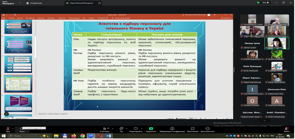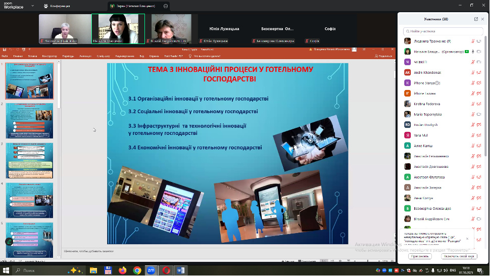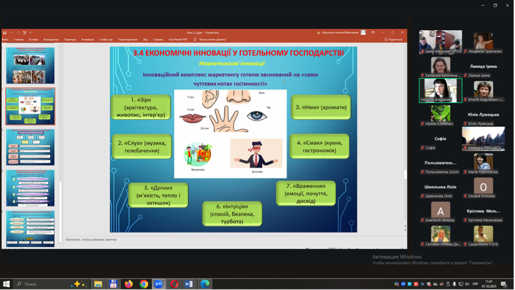 Під керівництвом Людмили ТРАНЧЕНКО доктора економічних наук, професора кафедри туризму та готельно-ресторанної справи 7 жовтня 2025 р. здобувачі спеціальності J 2 «Готельно-ресторанна справа та кейтеринг» ОР «бакалавр» долучилися до відкритої лекції яку проводила Наталія ВЛАЩЕНКО, к.е.н., доцент кафедри туризму і готельного господарства Харківського національного університету міського господарства імені О.М. Бекетова у рамках роботи освітньо-виробничого наукового кластеру «Освіта, наука та практика для майбутнього».