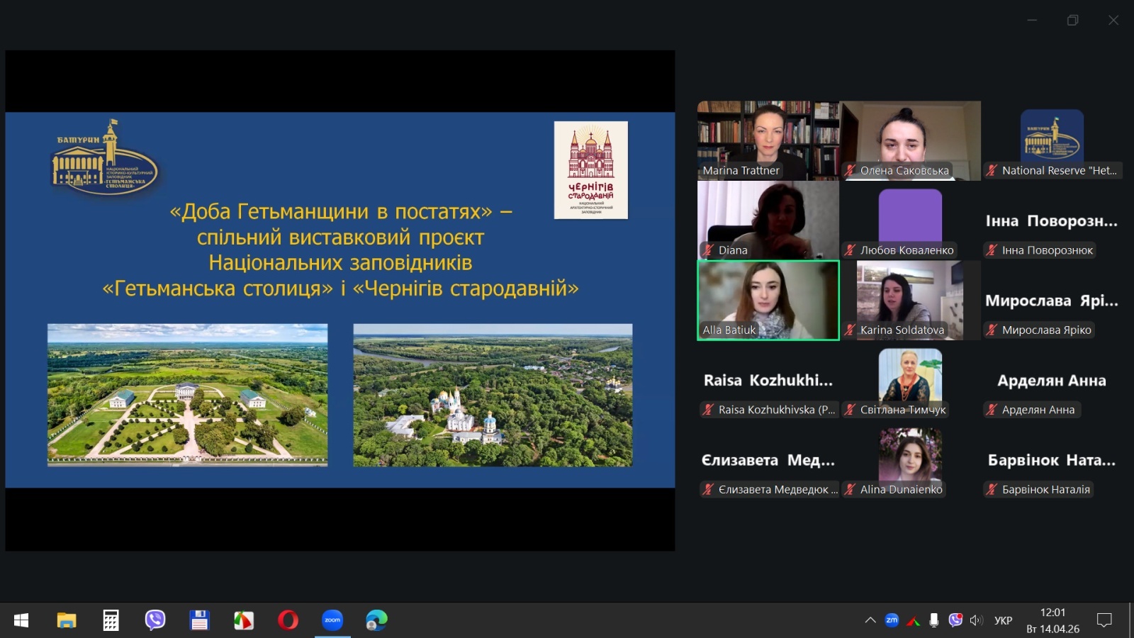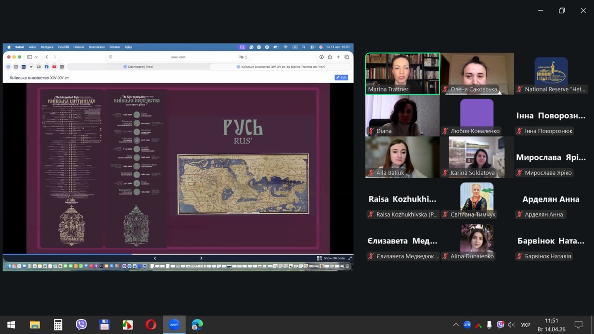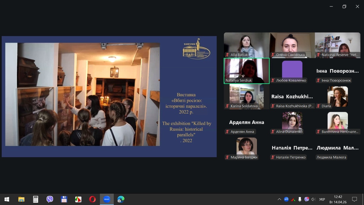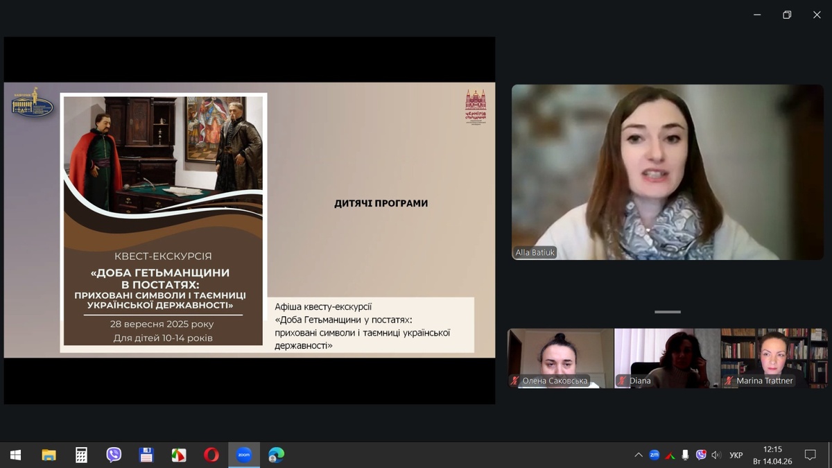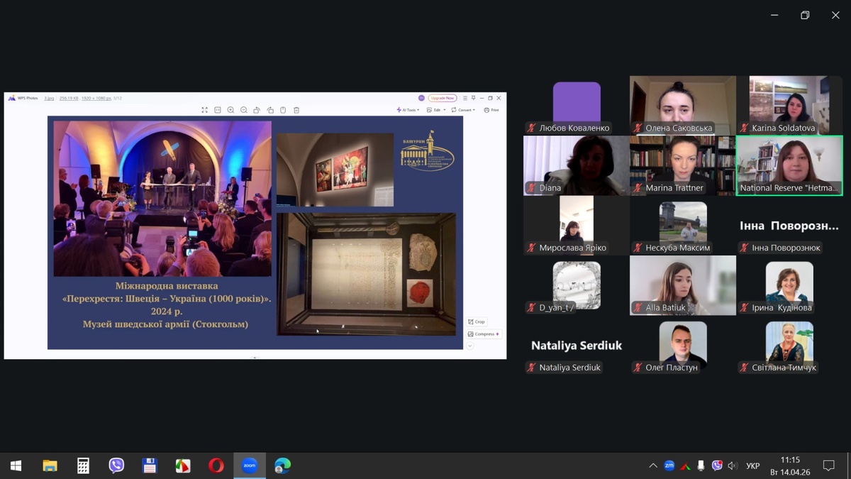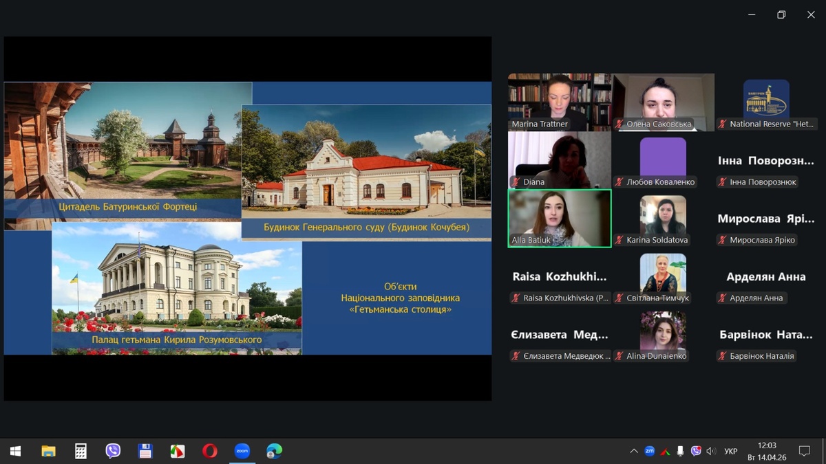 14 квітня 2026 року відбувся вебінар «Розвиток культурно-історичного туризму на прикладі виставкової та експозиційної діяльності Національного заповідника «Гетьманська столиця», участь в якому взяли наукові співробітники Національного історико-культурного заповідника «Гетьманська столиця», науково-педагогічні працівники кафедри туризму та готельно-ресторанної справи Уманського національного університету та здобувачі вищої освіти, які навчаються за спеціальностями «Туризм та рекреація» і «Готельно-ресторанна справа та кейтеринг».