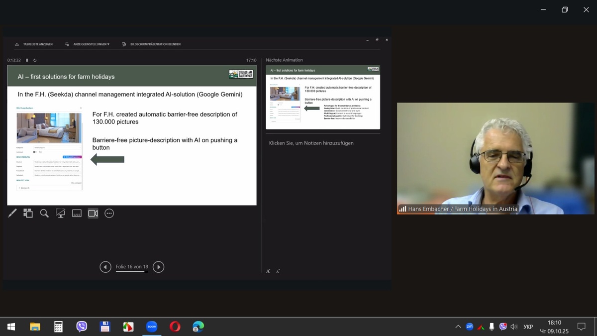 Під його керівництвом мережа Farm Holidays in Austria стала моделлю якості, сталості та інновацій із понад 2000 фермерськими господарствами-членами. Ганс поділився досвідом, як ця асоціація використовує ШІ для управління якістю, маркетингу та підтримки своїх членів.