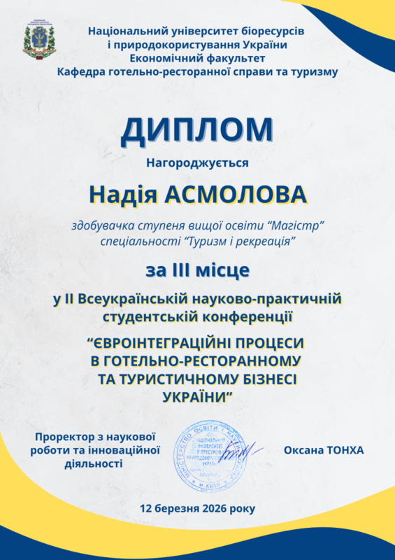Здобувачка вищої освіти спеціальності «Туризм та рекреація» Надія Асмолова зайняла ІІІ місце на ІІ Всеукраїнській науково-практичній студентській конференції «Євроінтеграційні процеси в готельно-ресторанному та туристичному бізнесі України»