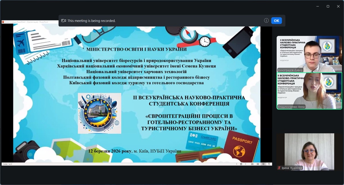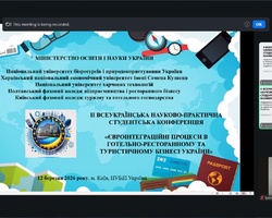 12 березня 2026 р. на кафедрі готельно-ресторанної справи та туризму економічного факультету Національного університету біоресурсів і природокористування України відбулася ІІ Всеукраїнська науково-практична студентська конференція «Євроінтеграційні процеси в готельно-ресторанному та туристичному бізнесі України». Захід об’єднав понад 150 учасників, які представляли 15 закладів вищої освіти з різних регіонів України.