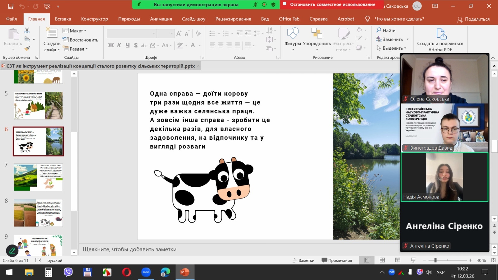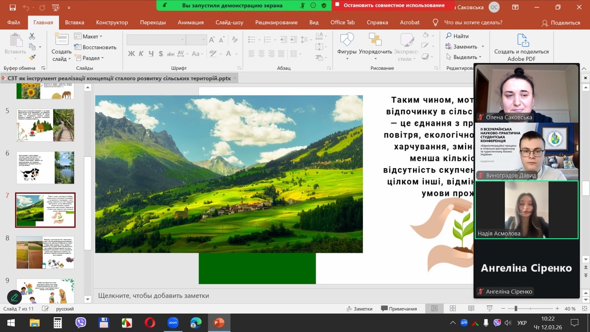 За результатами голосування членів конкурсної комісії ІІІ місце зайняла Надія АСМОЛОВА, здобувачка другого (магістерського) рівня вищої освіти спеціальності J3 «Туризм та рекреація» 11м-тм групи факультету менеджменту Уманського національного університету, яка виступила з доповіддю «Сільський зелений туризм як інструмент реалізації концепції сталого розвитку сільських територій».